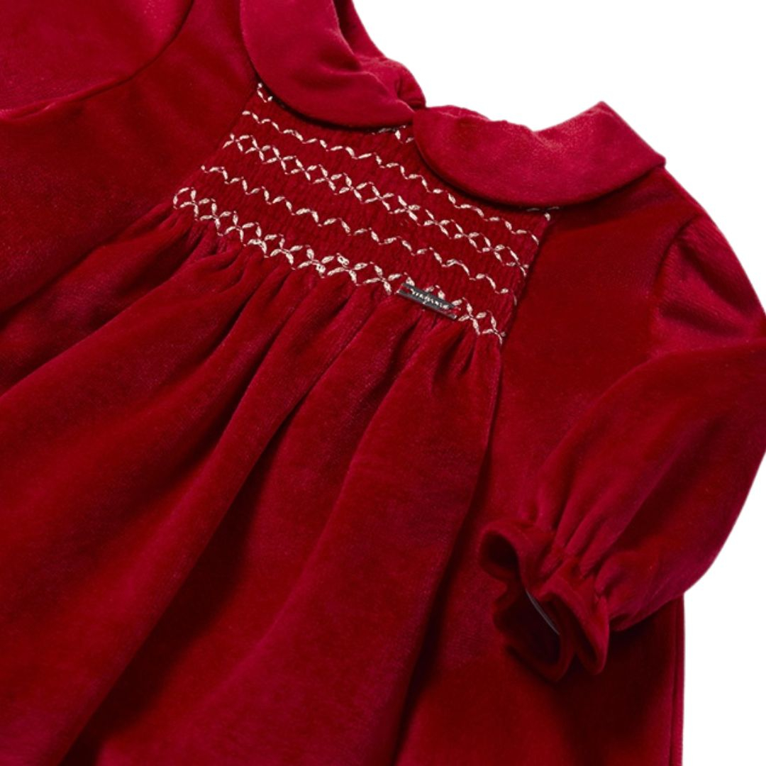 Rochie din catifea cu sclipici - rosuRochia are maneca lunga cu guler rotund tip polo si cu volane la baza manecii. Inchiderea se realizeaza cu fermoar ascuns pe spate, pentru a facilita imbracarea micutei.Este fabricat din material de catifea eleganta si clasica. Acest model are detalii incretite tip fagure. Material: exterior - 100% poliester captuseala - 100% bumbacCuloare: rosuIntretinere: