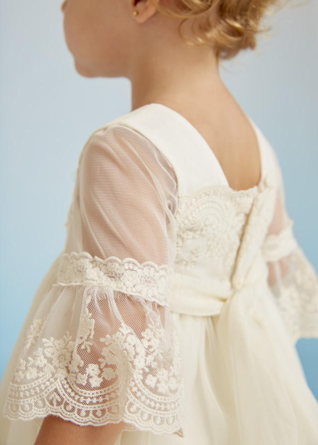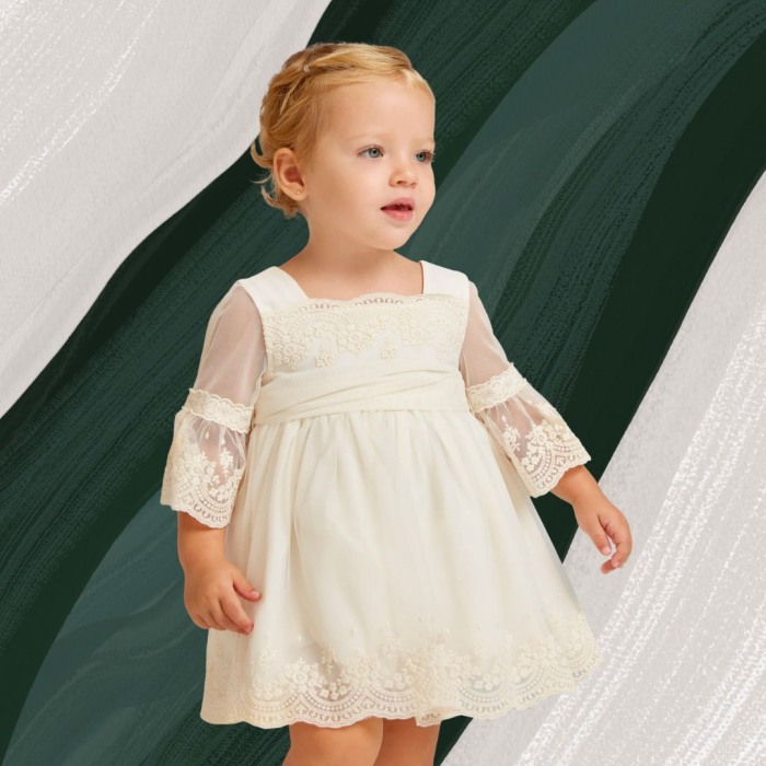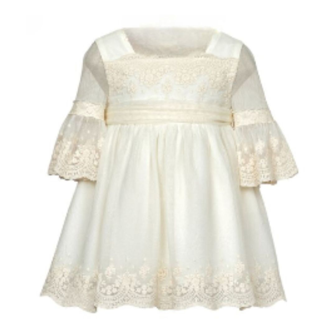 Rochie Broderie Bej CeremonieRochita cu maneci trei sferturi si guler patrat. Inchiderea se face pe spate cu 3 nasturi. Mixul de tesuturi combinate realizeaza un design unic si elegant. Materialul din care este realizata rochita este transparent cu o broderie superba. Manecile sunt din dantela si sunt largi de deasupra cotului.Modelul este incretit usor in talie si este captusit.See prinde cu un cordon care se poate lega la spate printr- o fundita.Aceaasta rochita eleganta si sofisticata o va face pe fetita ta sa se simta unica si minunata la orice eveniment!Material:rochie79% Poliester