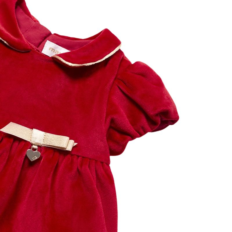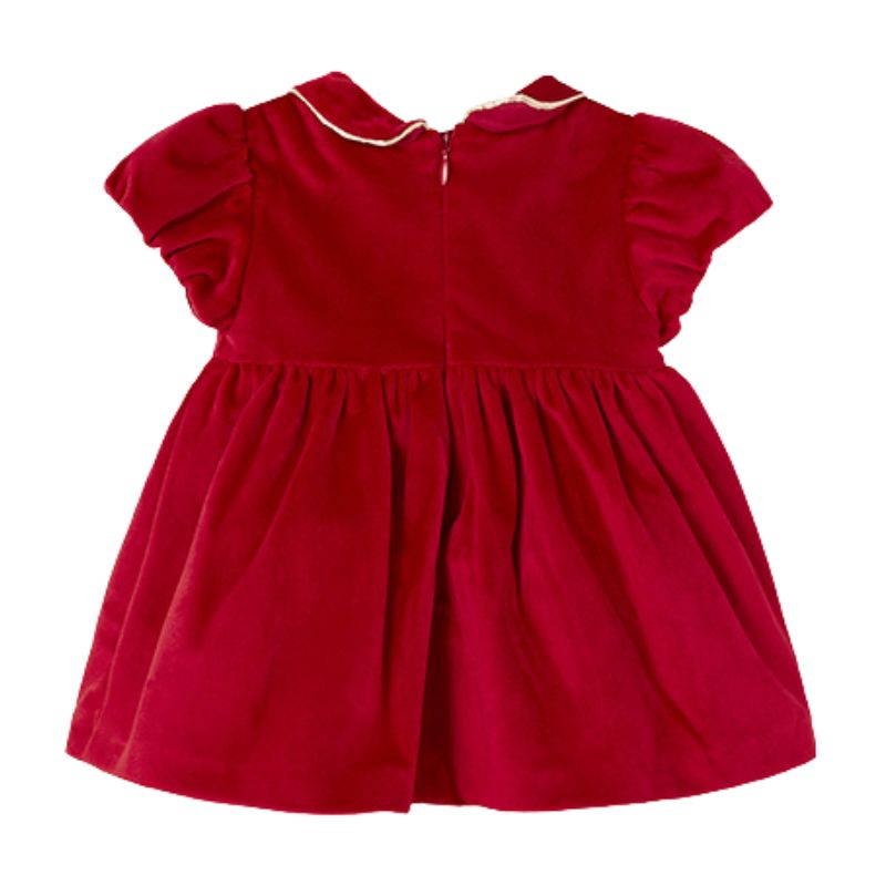 Rochie catifea + boneta - RosuSetul cuprinde: - rochita - bonetaRochitaRochita eleganta din catifea cu maneci scurte si bufante, are gulerul rotund tip camasa si se inchide cu fermoar invizibil pe spate. Pe guler si boneta sunt detalii elegante aurii. Potrivita pentru ceromonii sau evenimente speciale. Bebe se va simti minunat si va fi admirat de toata lumea!Design: fundita bej sidef aplicata + o inimioara micuta tot sidef auriuMaterial: rochita - 99% poliester / 1% fibre metalice