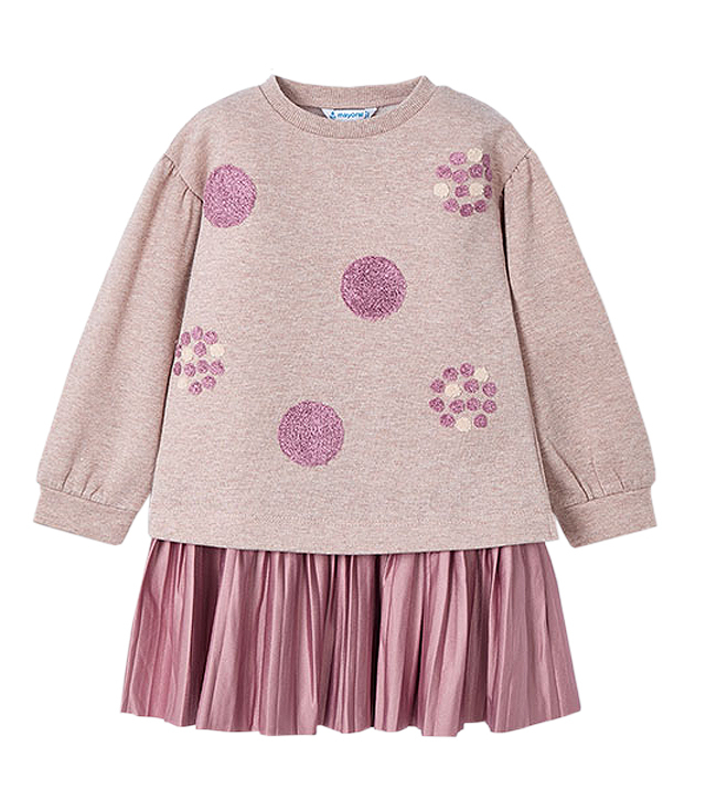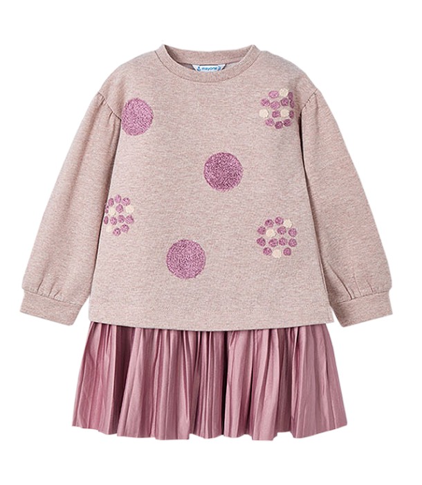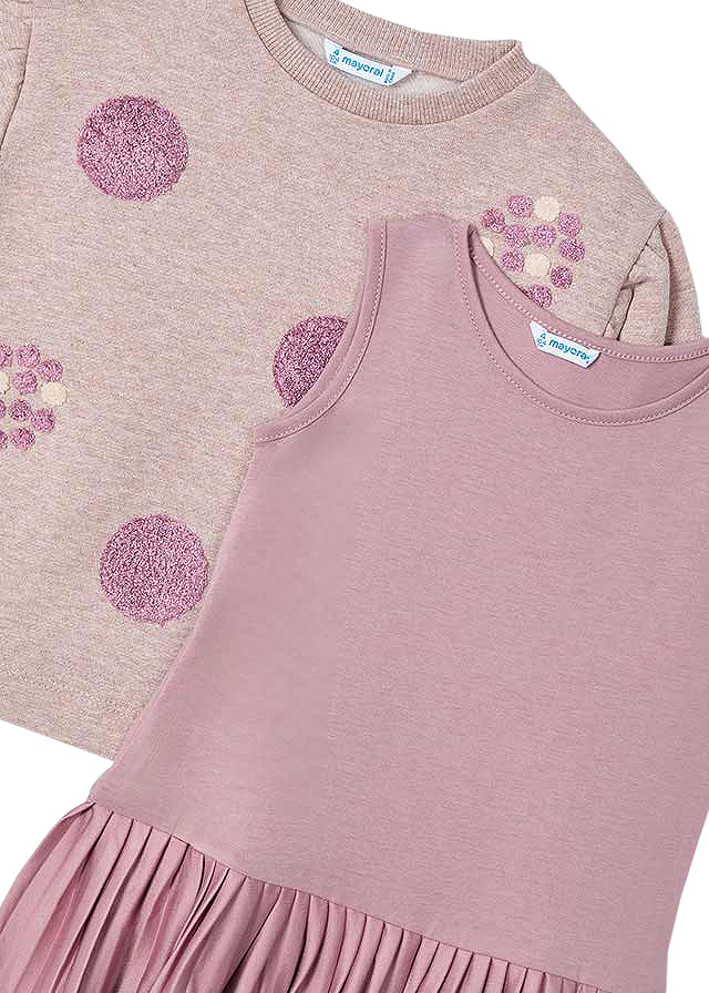 Rochie cu bluza - rozRochia fara maneci este de fapt un sarafan iar are pliuri, din diferite materiale pentru a obtine un design unic si special. Gulerul este elastic, rotund pentru a usura imbracarea. Bluza cu maneca lunga este confectionat dintr-un material calduros din plus gros, perfect pentru lunile reci. Acesta are deschideri laterale pe tiv care dau mai multa libertate. Maneca este usor incretita si cu mansete late. Tesatura bluzei in exterior este putin sclipitoare (materialul are insertii aurii usor lucioase) iar partea din interior este moale si pufoasa.Design: aplicatii broderii cercuri roz pudrat iesite in relief.Material: rochie - 72% poliester / 23% bumbac / 5% elastan bluza - 49% poliester / 45% bumbac / 5% fibre metalice / 1% elastanCuloare: rozIntretinere:
