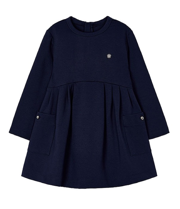 Rochie cu buzunare - bleumarin Rochia are maneca lunga, iar inchiderea se realizeaza cu fermoar ascuns pe spate.In talie are pliuri si aplicate 2 buzunare pe lateralul rochiei.Materialul tricotat elastic este moale cu cadere (tricot roma).Rochita are un croi foarte comod si poate fi purtata cu succes la gradinita sau la scoala.Design: sigla M brodata micut Material: 58% viscoza / 36% poliamida / 6% elastanCuloare: bleumarinIntretinere: