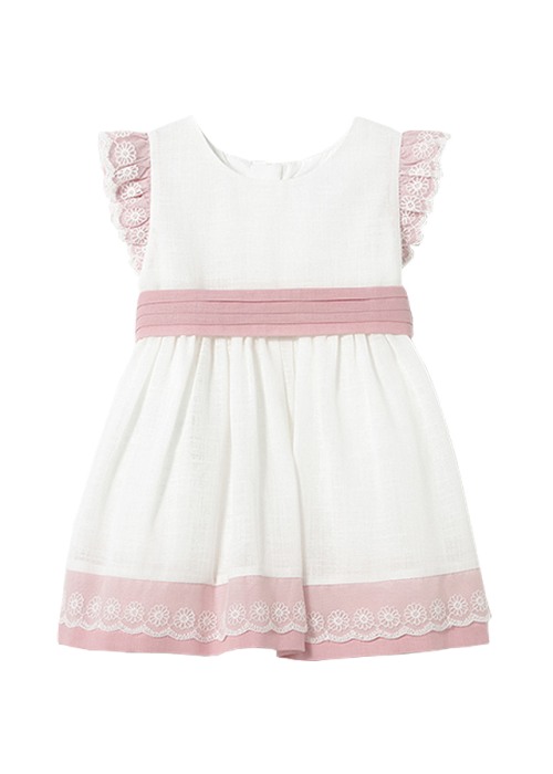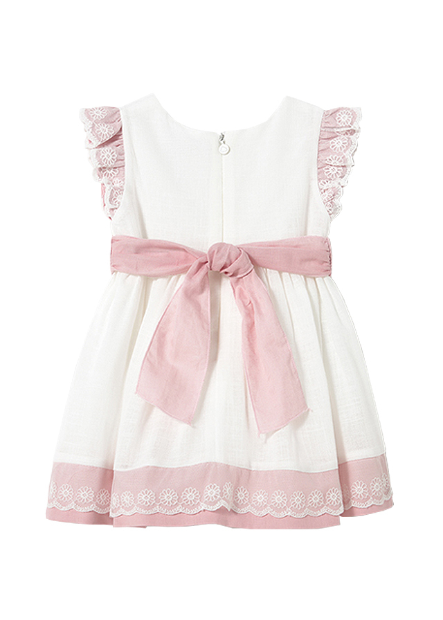 Rochie cu volane si cordon - alb / roz Rochita are maneca scurta cu volane, gulerul rotund, iar inchiderea se face cu fermoar invizibil pe spate, pentru a usura imbracarea ei.