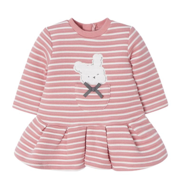 Rochie - IepurasRochita are gulerul rotund iar inchiderea se face cu fermoar ascuns pe spate , pentru a usura imbracarea .Modelul are volan in partea de jos si aplicatieiepuras pufos pe partea superioara iar materialul din care este facuta este unul dens si usor grosut. Rochita are un buzunar aplicat si o fundita mica gri.Material: 74% Bumbac 25% Poliester 1% ElastanCuloare: alb/roz Design: dungute si 1 iepurasIntretinere: