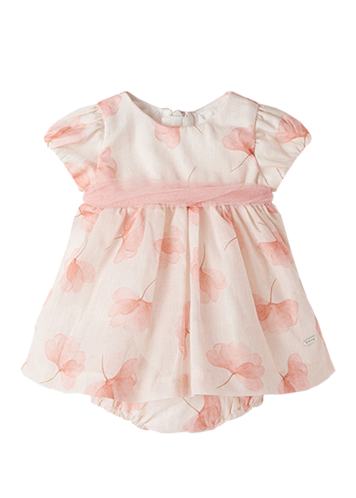 Rochie imprimeu floral + chiloteiSetul cuprinde: - rochita - chilotei Rochita cu maneca scurta are gulerul rotund, iar inchiderea se face cu fermoar pe spate, pentru a usura imbracarea ei.Modelul este incretit in talie, avand un cordon din tul.