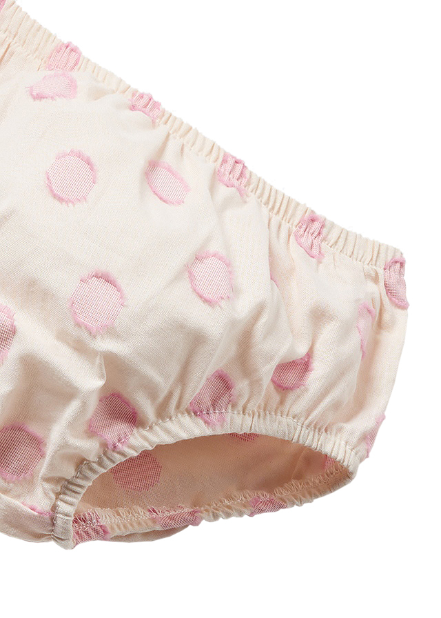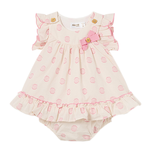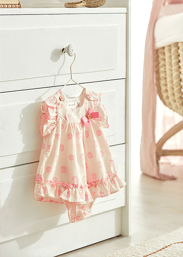 Rochie jacquard - Better Cotton Setul cuprinde: - rochie - chilotei Rochita fara maneci are gulerul rotund, iar inchiderea se face cu nasturi pe ambii umeri, pentru a usura imbracarea ei.Model este incretit in talie, avand volane aplicate pe umeri si pe marginea ei.Chiloteii au elastic in talie si se asorteaza perfect cu rochita.Material fluid pentru un confort maxim. Elemente decorative: fundita Material: rochie - exterior - 85% bumbac / 15% poliester captuseala - 100% bumbac chiloti - 85% bumbac / 15% poliesterCuloare: galben pai / rozImprimeu: bulineIntretinere: