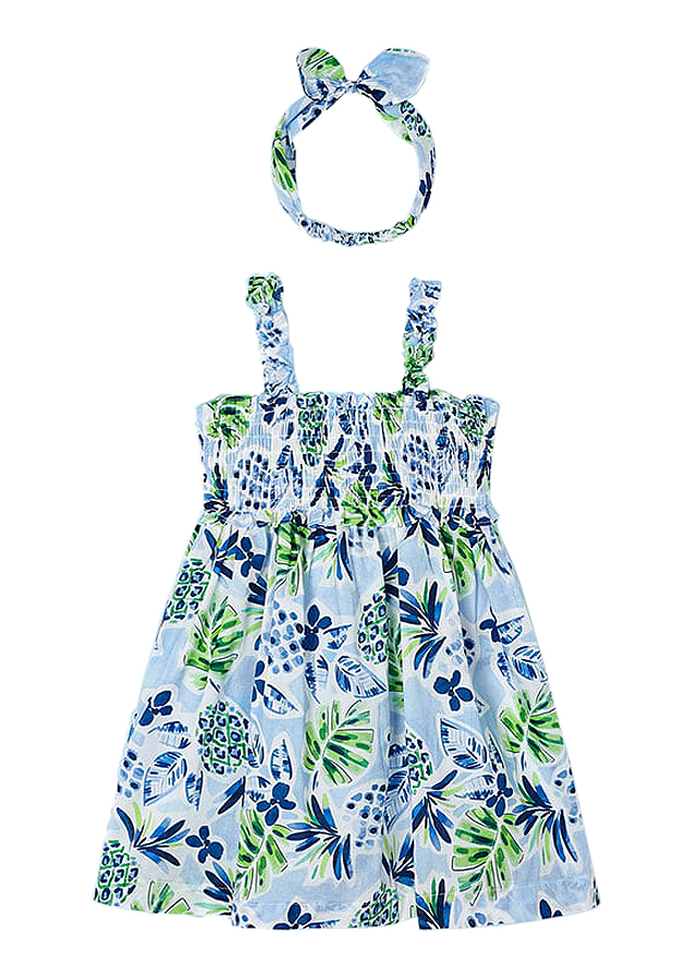 Rochie jungla cu bentita - MayoralRochita cu bretele si inchidere cu funda pe spate.Modelul este incretit pe bust cu elastic lejer.Rochita este insotita de o bentita cu fundita din acelasi material.Material: Exterior: 100% BumbacCuloare: albastru indigoImprimeu: junglaIntretinere: