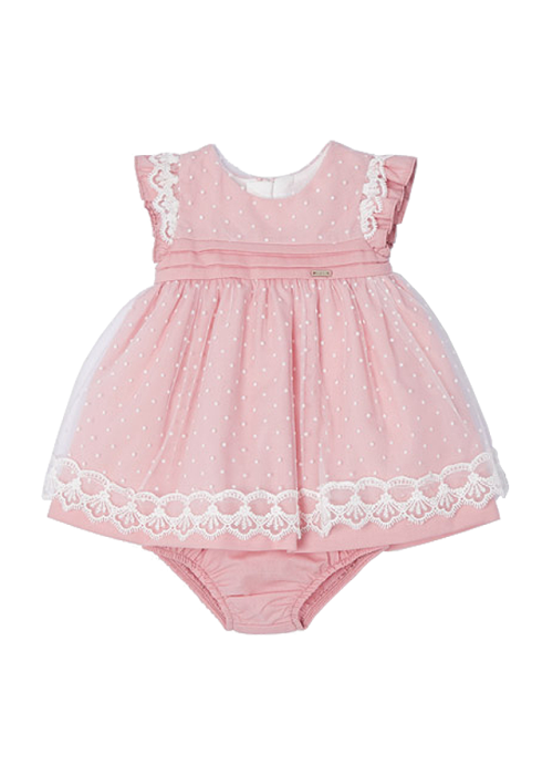 Rochie muselina + chilotei - Roz pudratSetul cuprinde: - rochita - chilotei Rochita fara maneci are gulerul rotund, iar inchiderea se face cu fermoar pe spate, pentru a usura imbracarea ei.Modelul este incretit in talie, avand deasupra tul cu buline si dantela.