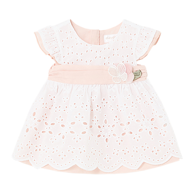 Rochie perforata Better Cotton - Mayoral Rochia fara maneci are gulerul rotund iar inchiderea se face pe spate cu fermoar invizibil. Modelul este incretit in talie si este captusit. Captuseala are si un volanas din tul pentru a se aseza mai bine fusta.In talie este prinsa o banda lata ce are aplicat pe partea din fata o floare si un fluture in relief,alb brodat.Panza cu broderie sparta este aplicata peste o captuseala tot din panza de culoarea piersicii.Material: rochie - 100% Bumbac captuseala - 100% Bumbac cordon - 100% Bumbac