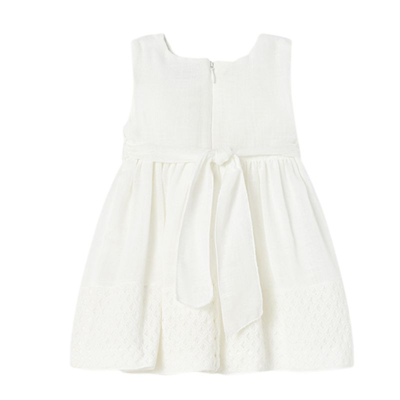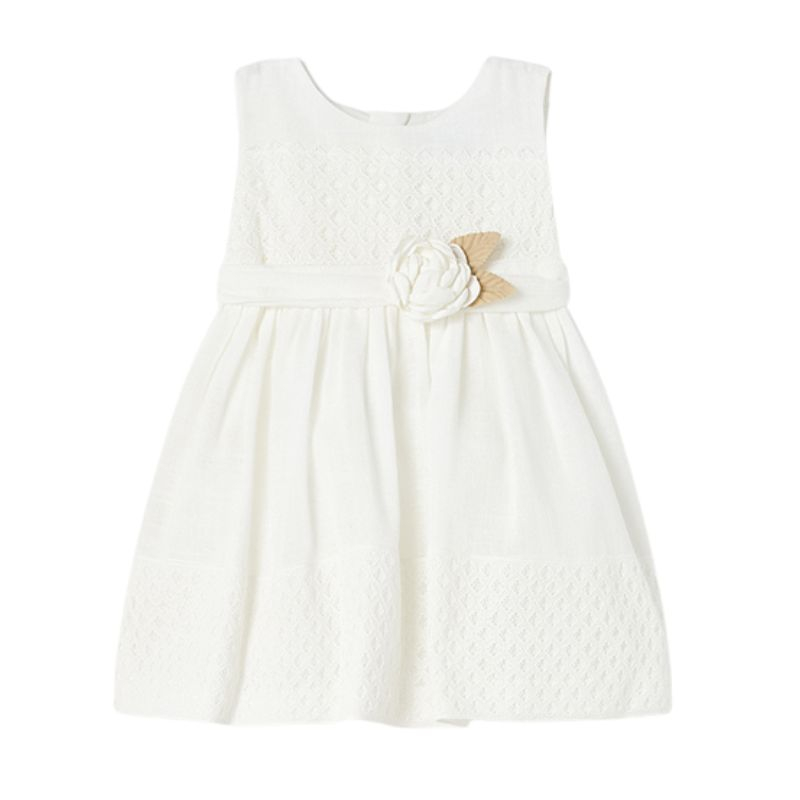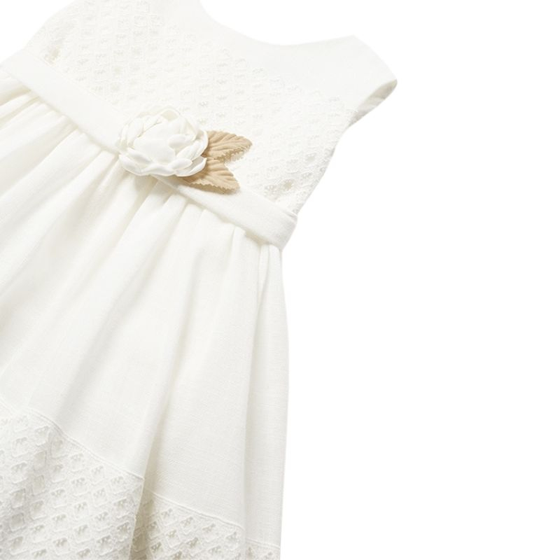 Rochie Romburi - Mayoral Rochia fara maneci are gulerul rotund iar inchiderea se face pe spate cu fermoar invizibil. Modelul este incretit in talie si este captusit. Captuseala are si un volanas din tul pentru a se aseza mai bine fusta.In talie se prinde cu un cordon lung ce se poate lega la spate prin fundita. Are aplicat pe partea din fata o floare alba de trandafir cu frunze bej.Material: rochie - 63% Bumbac 37% Poliester captuseala - 55% Poliester 30% Bumbac 15% Poliamidă cordon - 50% Bumbac 50% Poliester