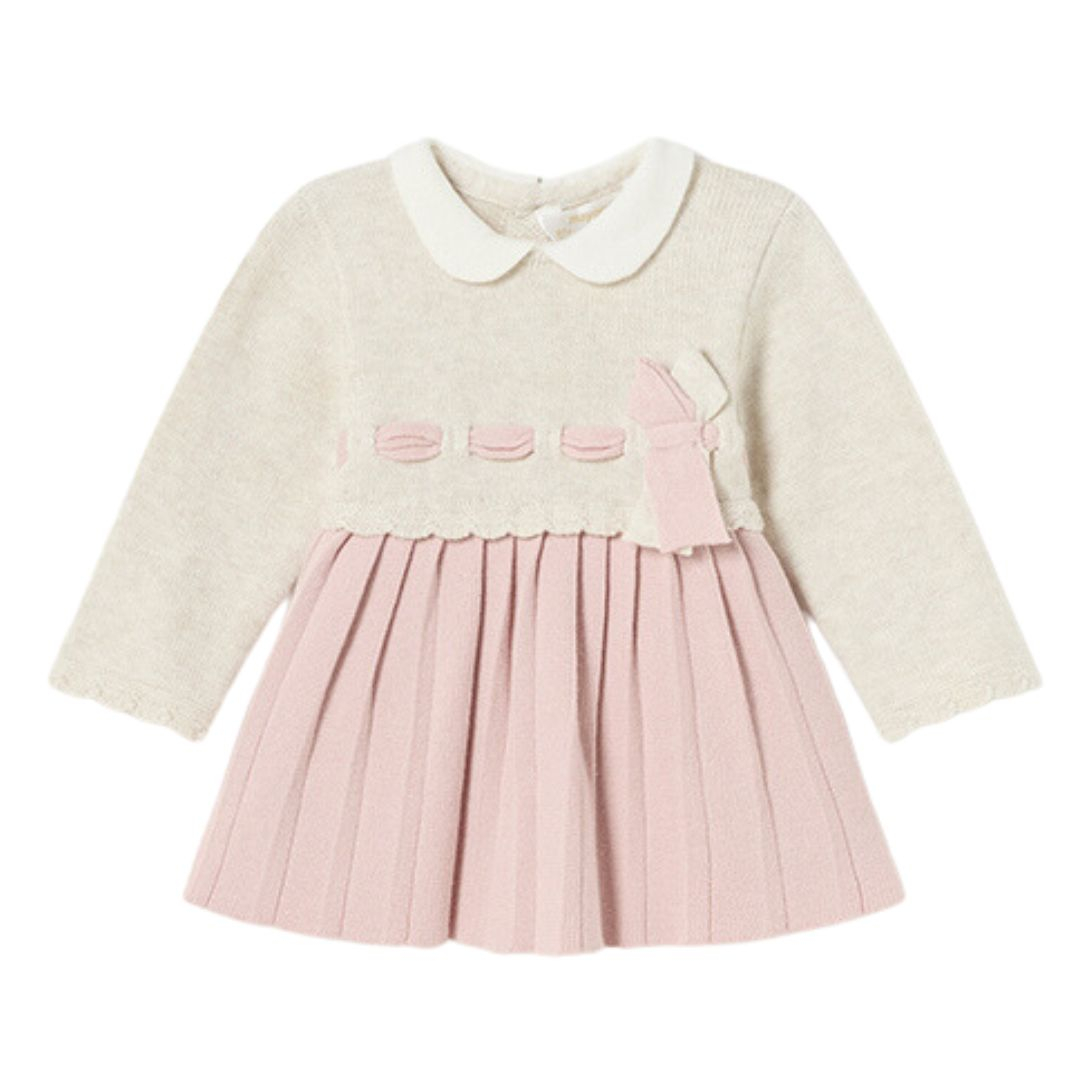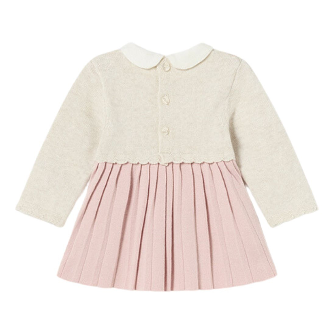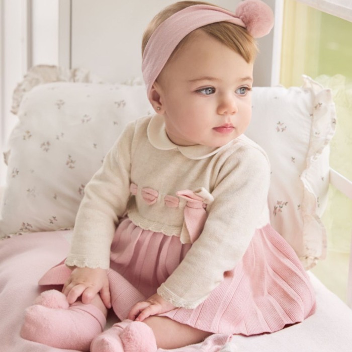 Rochie tricot Better Cotton nou-nascut - MayoralRochia cu maneca lunga are gulerul rotund tip camasa din panza.Inchiderea se realizeaza cu nasturi pe spate, pentru a facilita imbracarea micutei.Cordon cu fundita. Fusta plisata. Material:100% BumbacCuloare: roz / bejIntretinere: Spalare: automata / manuala Temperatura: max. 30°C Stoarcere: automata la un numar mediu de rot./min. / manuala Interzis: albirea, curatarea chimica si uscarea la tambur Uscare: plan drept Calcare: max. 110°C