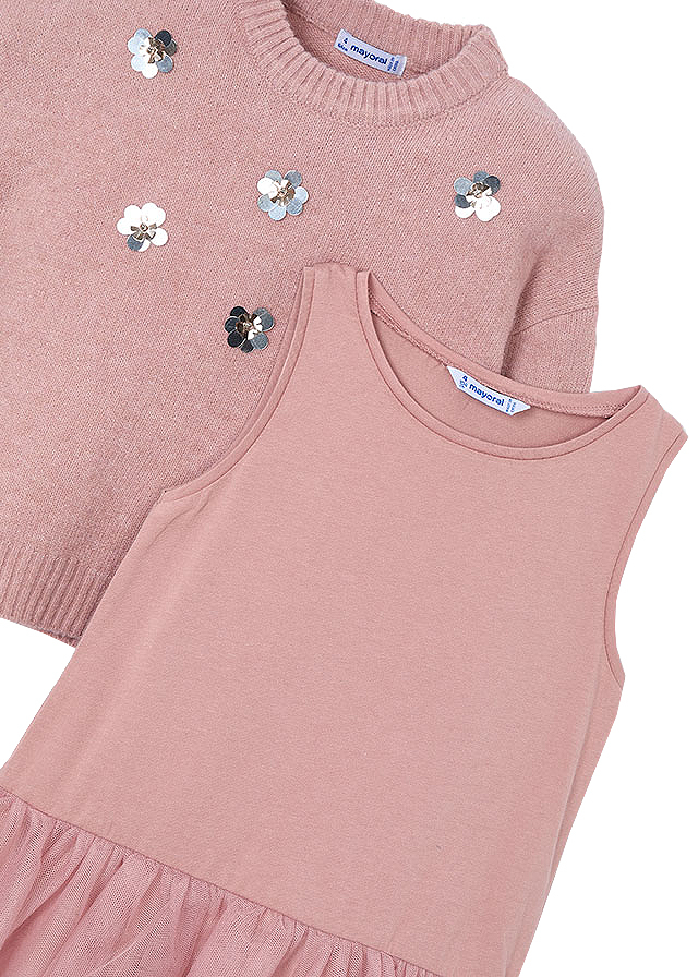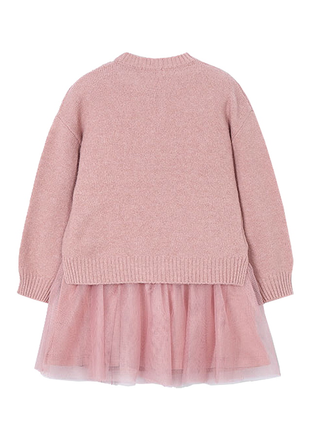 Aceasta este din tricot partea de sus, fiind moale si placuta la atingere, iar partea de jos este incretita in talie, din tul, fiind lejer si vaporos.Puloverul cu maneca lunga are gulerul rotund.Materialul este calduros, elegant si sofisticat pentru ocaziile speciale.Elemente decorative: aplicatii florale, detalii cu nervuri.