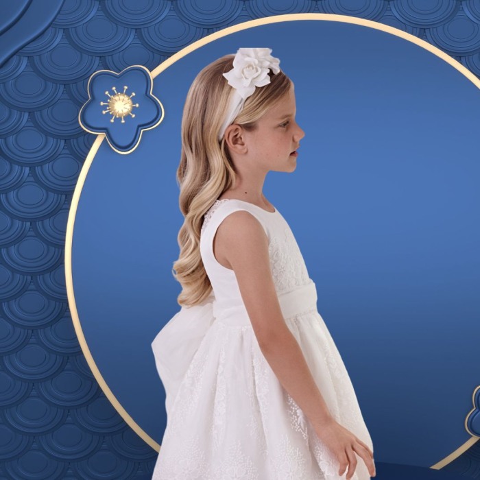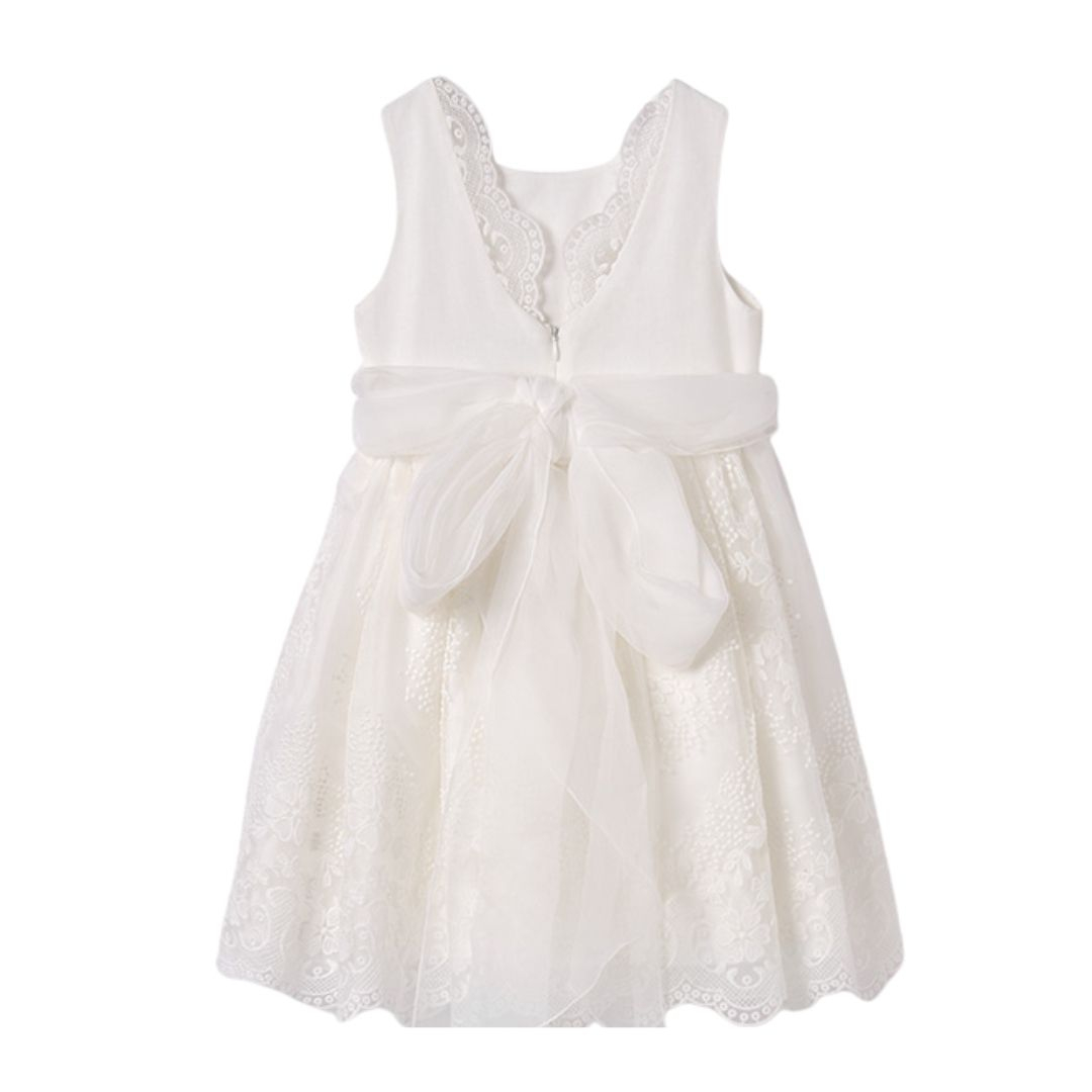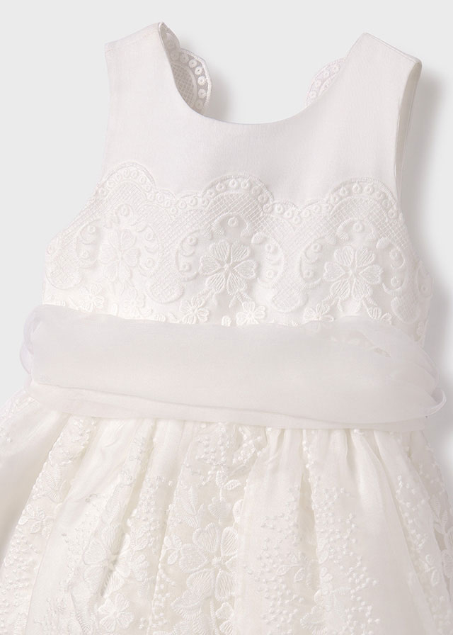 Rochie Tul alb Rochita fara maneci dintr-un material usor si fin ce se inchide pe spate cu fermoar ascuns.. In talie rochita are un cordon amplu din tul ce se poate lega la spate cu o funda simpatica. Atat pe fusta cat si pe bust materialul este brodat.