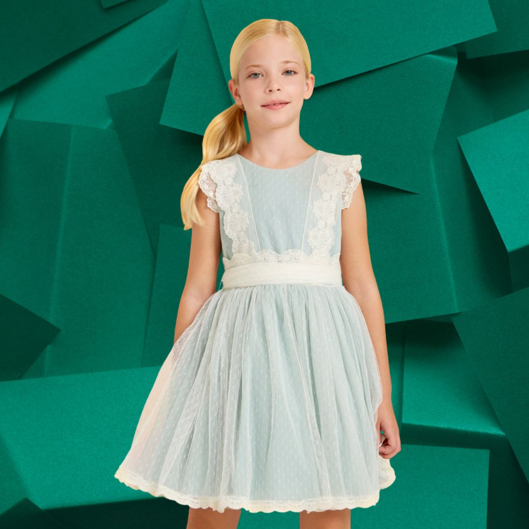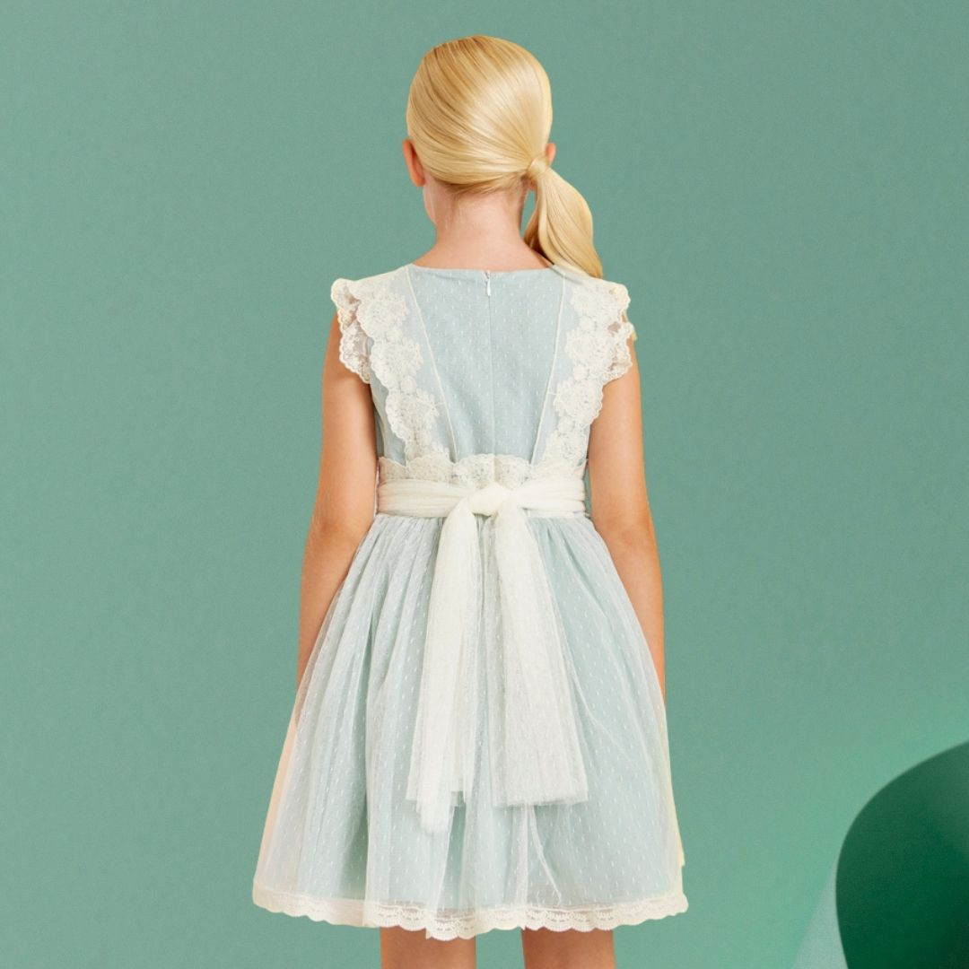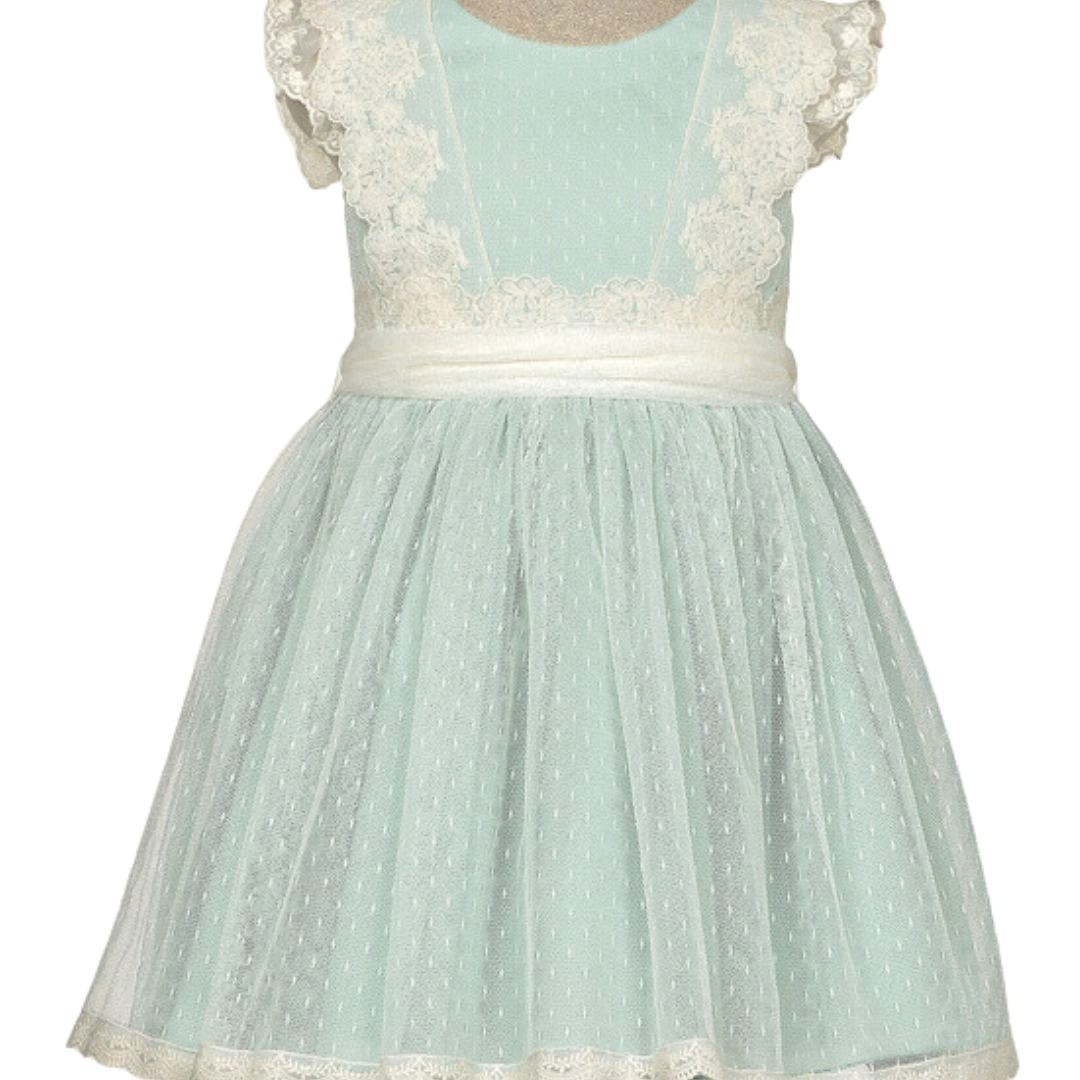 Rochie Vernil Tul Plumeti Ceremonie - Abel & lulaRochita fara maneci are gulerul rotund  iar inchiderea se face pe spate cu fermoar ascuns. Un volanas scurt acopera manecile. Mixul de tesuturi combinate realizeaza un design unic si elegant. Materialul din care este realizata rochita este transparent cu mici picatele din tesatura. Pe bust si in talie rochita are aplicata o dantela fina, eleganta, bej.Modelul este incretit usor in talie si este captusit. In talie se prinde cu un cordon care se poate lega la spate. Eleganta si diafana, rochita este potrivita ceremoniilor sau intalnirilor speciale.Material: rochie50% Poliester
