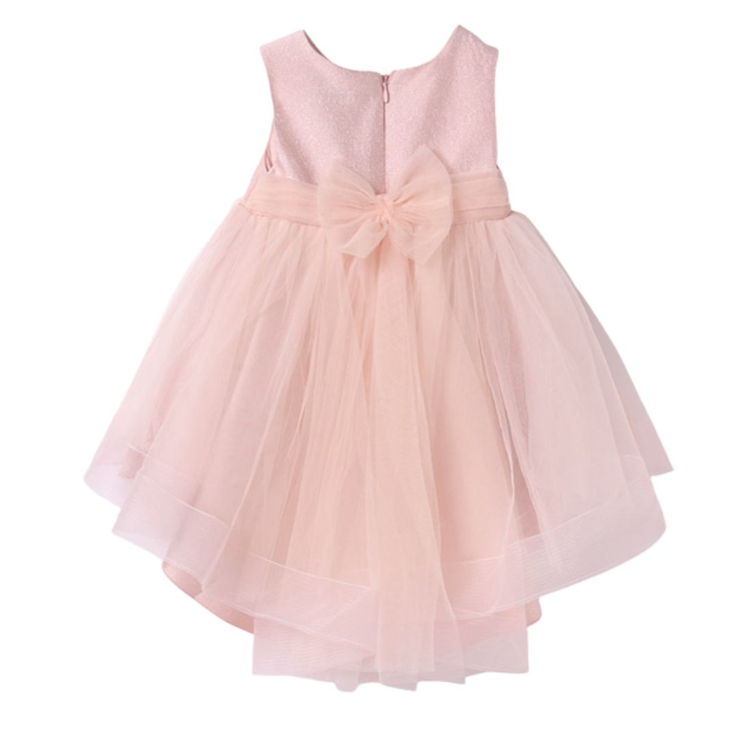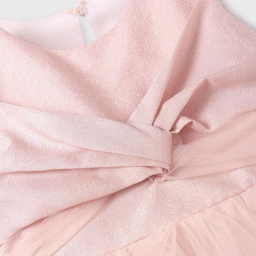 Rochie Tul roz Rochita fara maneci dintr-un material usor si fin ce se inchide pe spate cu fermoar ascuns.. In talie rochita are un cordon amplu din tul ce se poate lega la spate cu o funda simpatica.