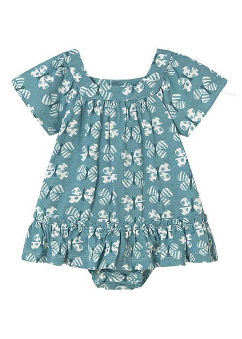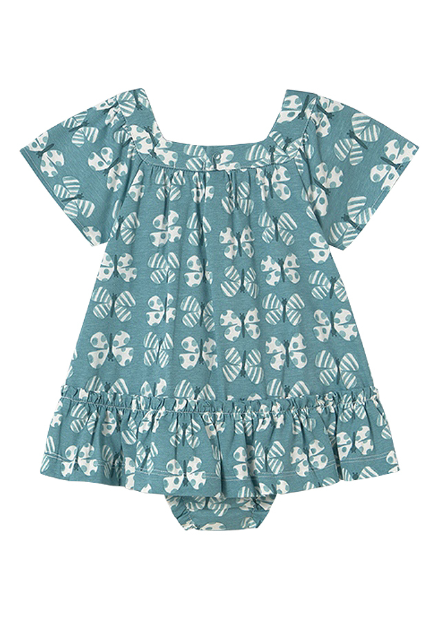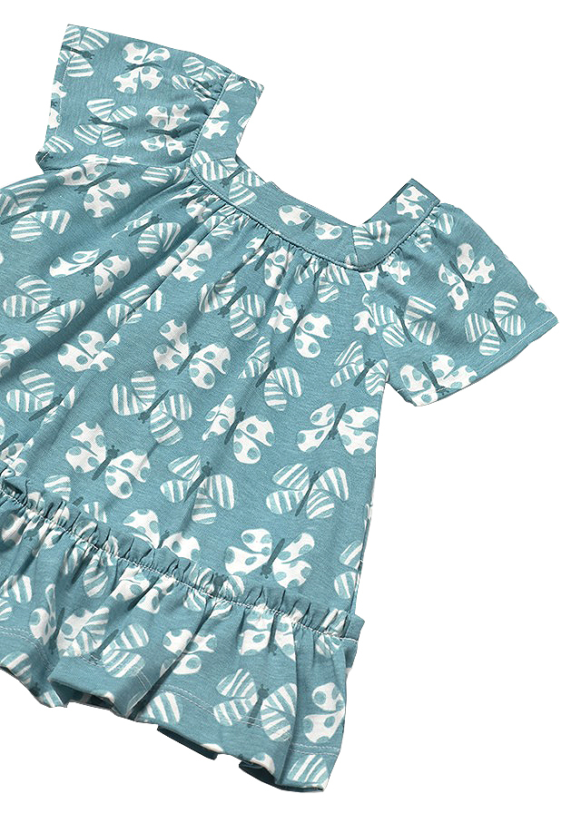 Rochia are maneca scurta si gulerul patrat. Modelul este incretit in talie.Elemente decorative: volanDesign: imprimeuChiloteii se asorteaza cu rochita avand talia reglabila.Design: imprimeuMaterial: rochie -100% bumbac                  chilotei - 100% bumbacCuloare: verdeImprimeu: fluturiIntretinere: