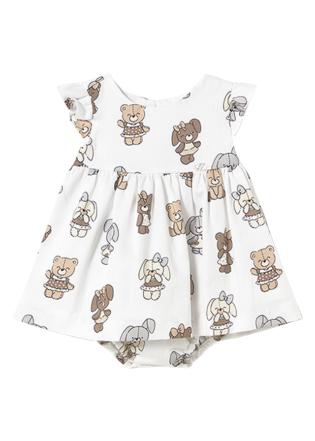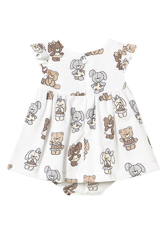 Rochia are gulerul rotund, volanase pe umeri si se inchide cu fermoar pe spate, pentru a usura imbracarea bebelusului. Modelul este incretit in talie si captusit.Design: ursuletiChiloteii se asorteaza cu rochita avand talia reglabila.Design: ursuletiMaterial: rochie - 10% bumbac                   captuseala - 100% bumbac                  chilotei - 100% bumbacCuloare: cremImprimeu: ursuletiIntretinere: