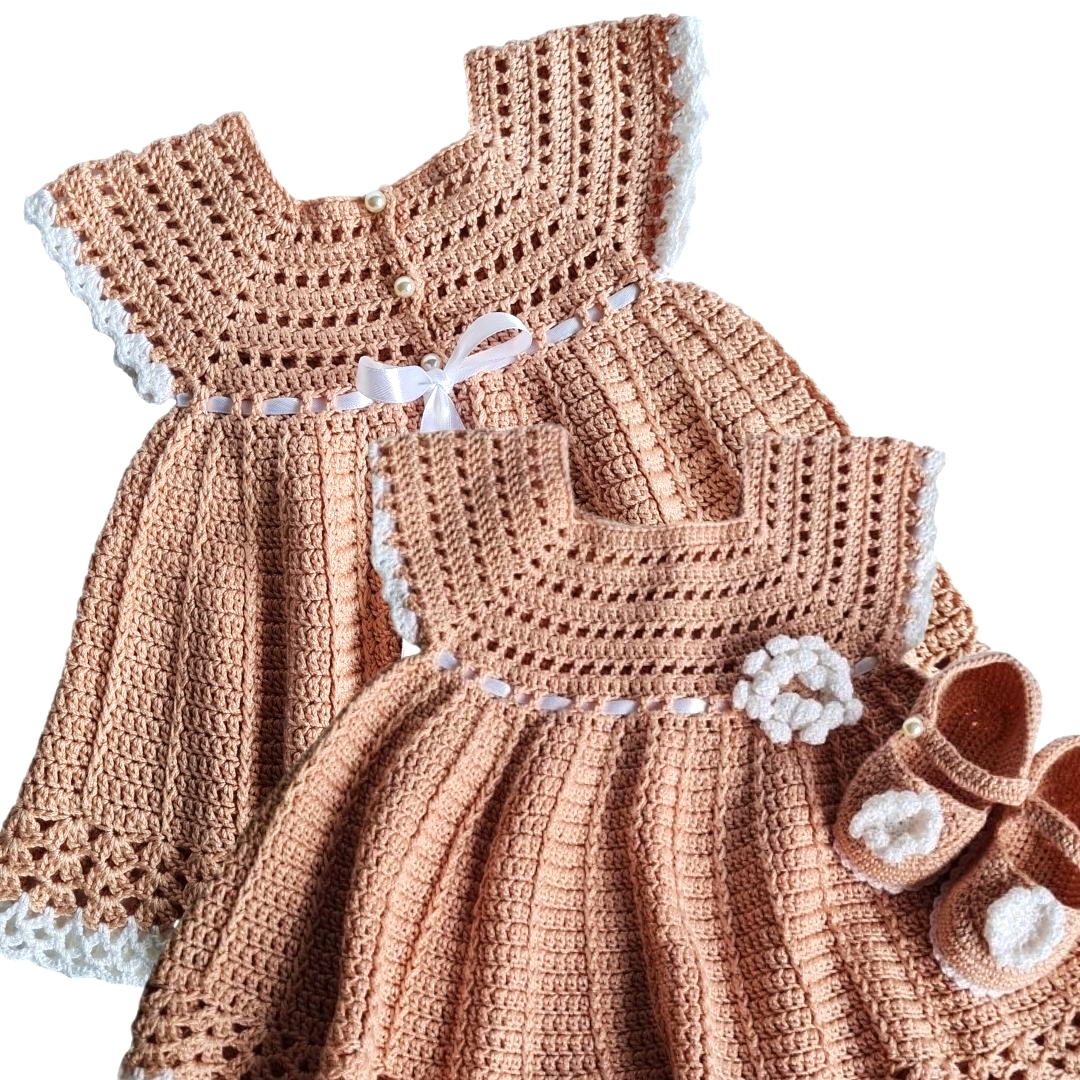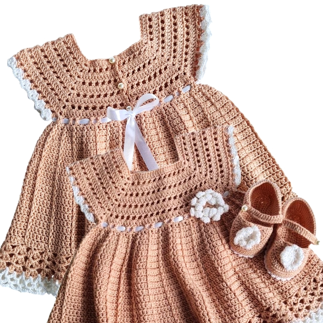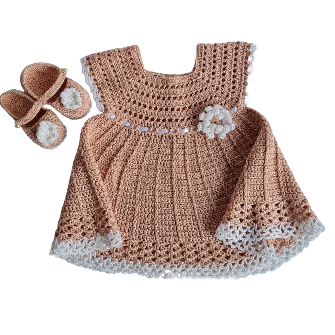 Rochita crosetata si pantofiori 0-3 luniPoti sa o numesti "Prima mea rochita" si "Primii mei pantofiori" si nu gresesti. O rochita unicat, handmade, cu detalii fine, fundita aplicata, nasturi perlute si o mica floricica aplicata pe partea din fata.Rochita poate fi un dar special de Baby shower sau la prima vizita si de ce nu, oricand vrei sa faci un cadou special lucrat manual cu migala, din materiale de calitate, alese atent.