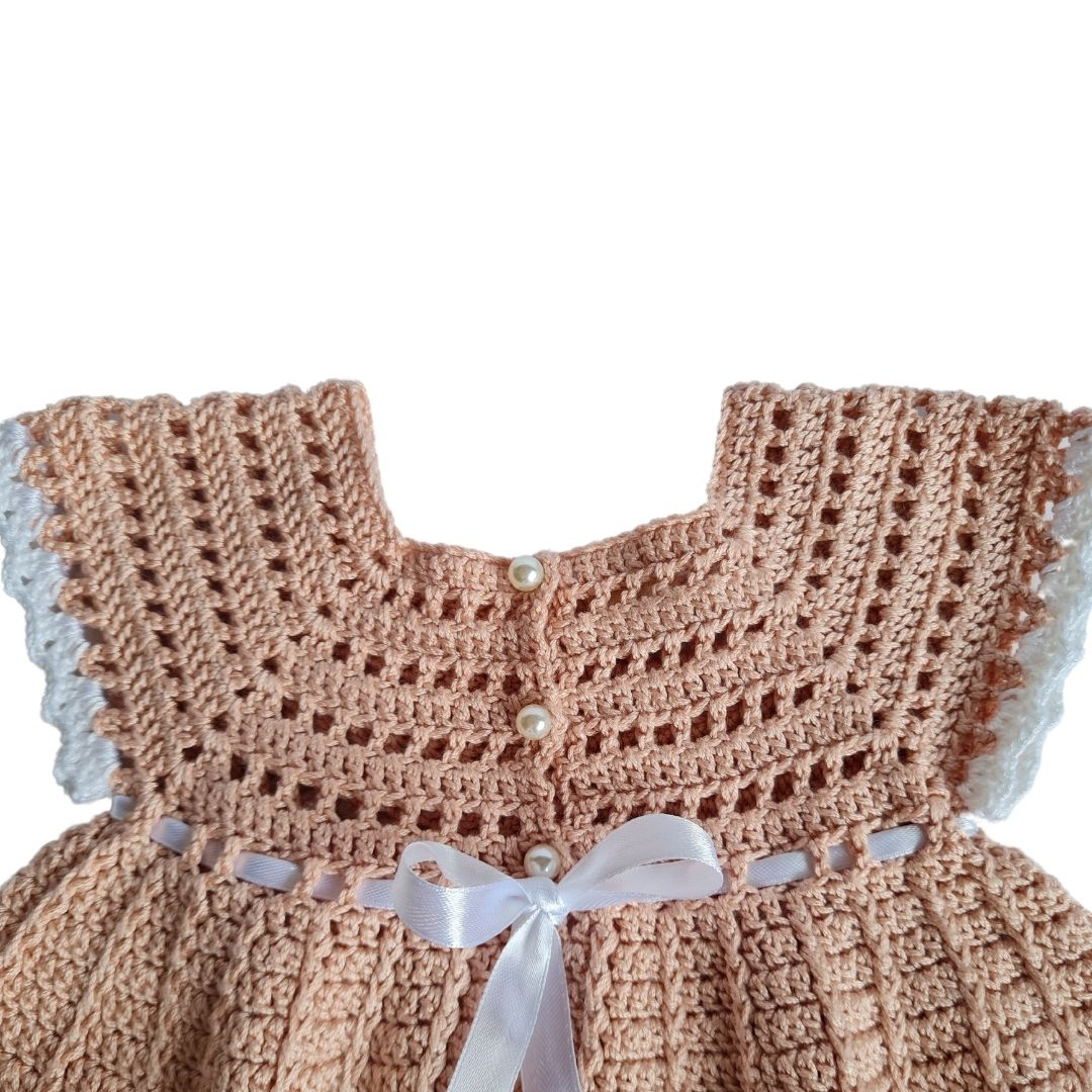 Si cum detaliile fac diferenta, te vei putea bucura de micuta ta printesa imbracata intr-o rochita unicat.RochitaRochita este fara maneci, la baza gatului, cu 3 nasturi pe spate si un cordon in talie dintr-o panglica satinata alba.La poale si la manecuta are o bordura alba tot crosetata.Material: 60% bumbac/40 acrilic