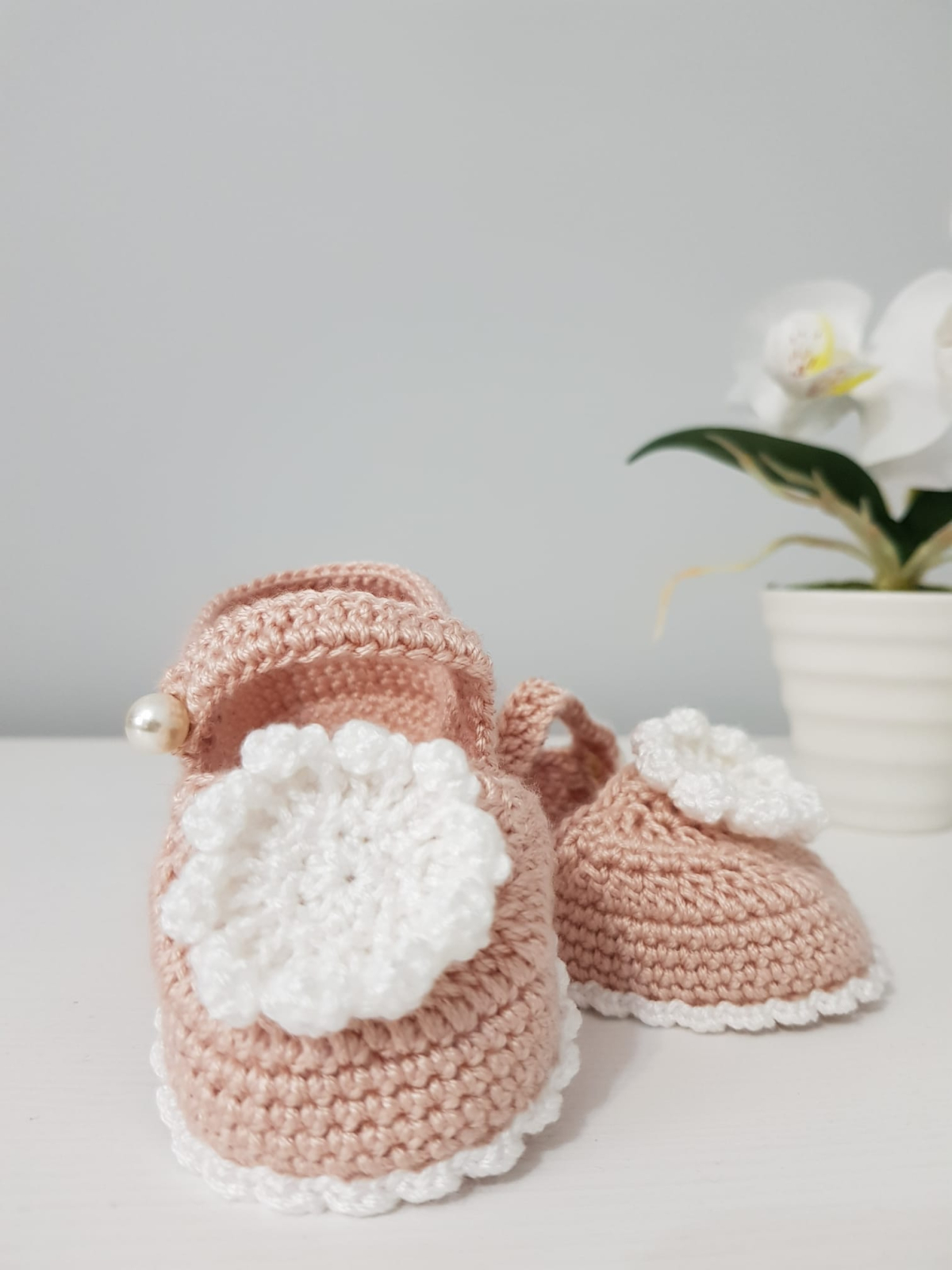 Marime: 0-3 luniPantofiori:Pantofiorii crosetati au o bretea ce se prinde cu o perluta pentru a-i fixa mai bine pe piciorul bebelusului. Au aplicata o floricica crosetata pe partea din fata, asemanatoare celei aplicate pe rochita. Talpa este marginita de o banda alba subtire tot crosetata ce duce cu gandul la o incaltaminte de exterior!Detalii: nasturi perlutaMarime: 0-3 luni (aproximativ 10 cm)