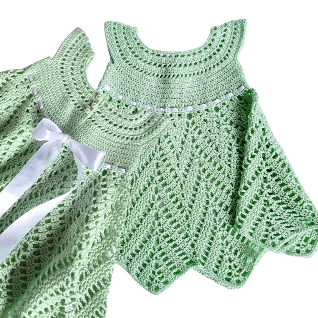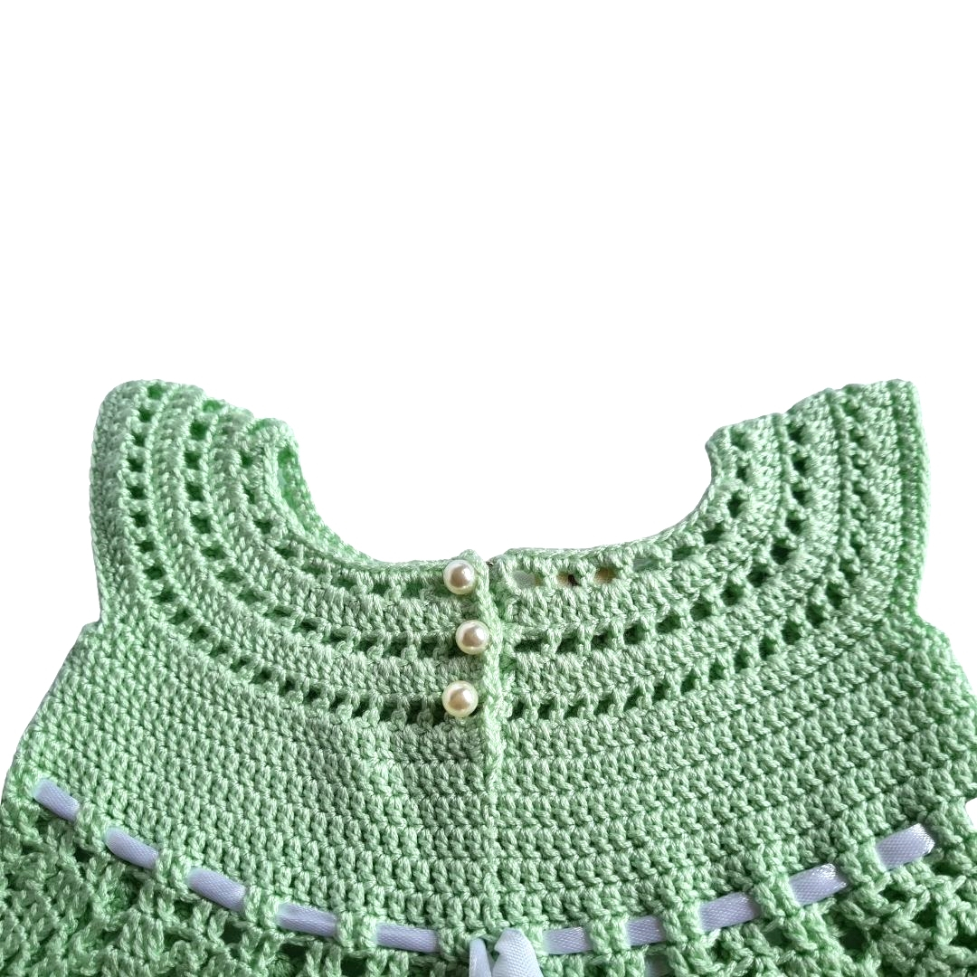 Rochita crosetata Vernil 0-3 luniPoti sa o numesti si "Prima mea rochita" si nu gresesti. O rochita unicat, handmade, cu detalii fine, fundita aplicata, nasturi perlute.Rochita poate fi un dar special de Baby shower sau la prima vizita si de ce nu, oricand vrei sa faci un cadou special lucrat manual cu migala, din materiale de calitate, alese atent.Rochita este fara maneci, la baza gatului, cu 3 nasturi pe spate si un cordon in talie dintr-o panglica satinata alba.Si cum detaliile fac diferenta, te vei putea bucura de micuta ta printesa imbracata intr-o rochita unicat.Material: 60% bumbac/40 acrilicCuloare: verde mentaDetalii: nasturi perluta si cordon din panglica satinata.Marime: 0-3 luniIntretinere: