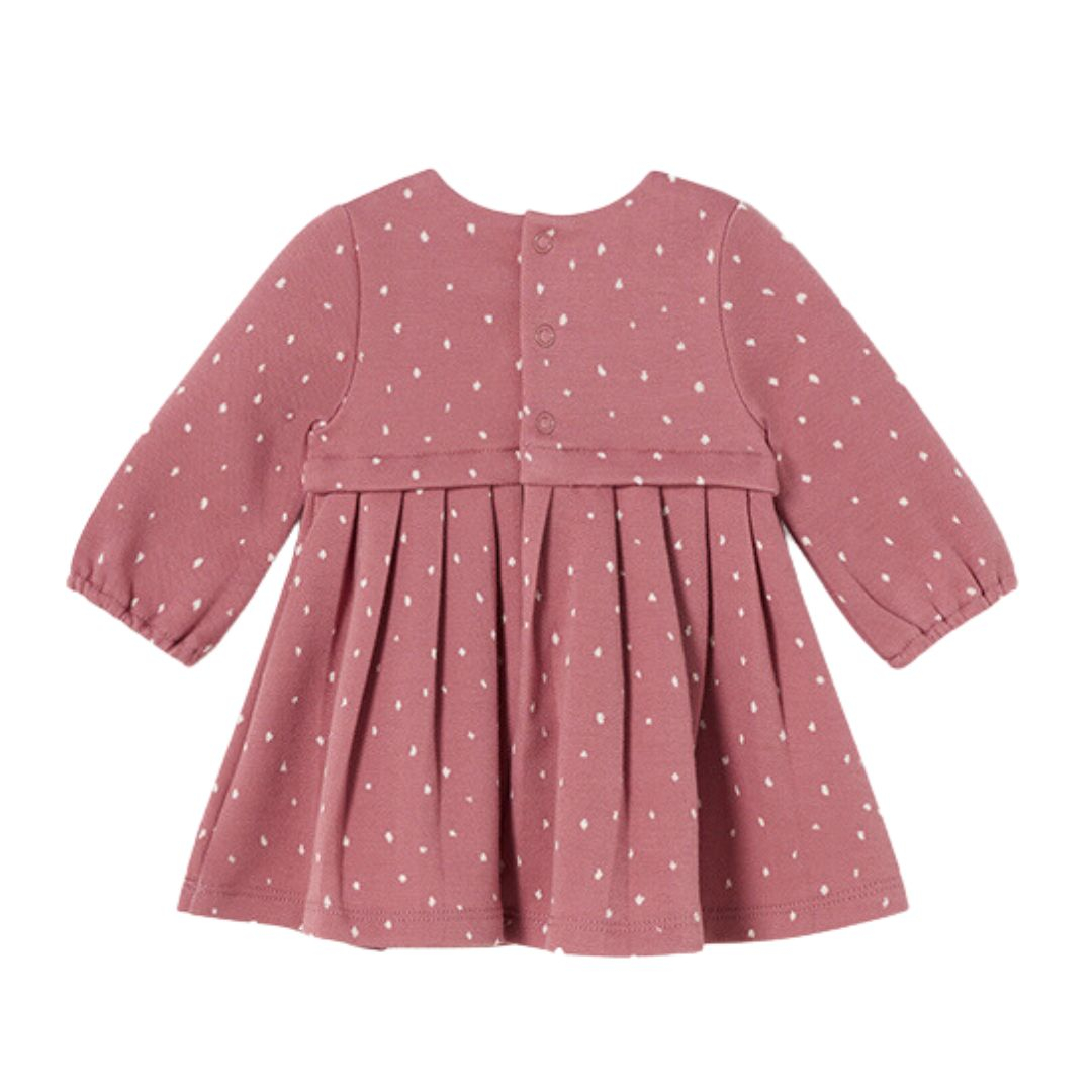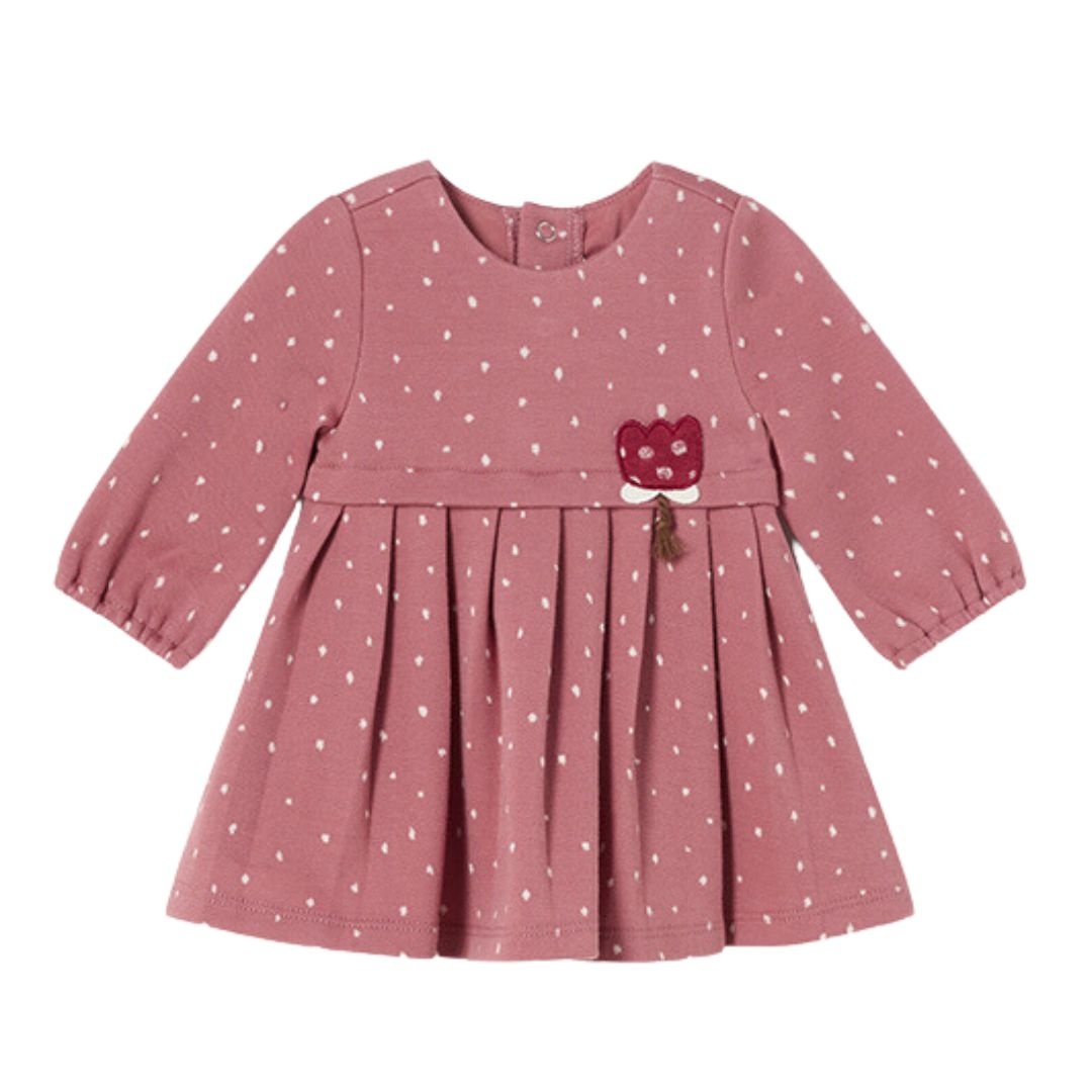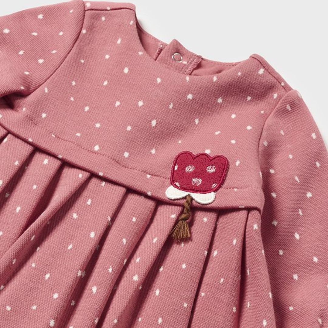 Rochita Jersey cu picatele - Mayoral Rochia are maneca lunga si guler rotund cu inchidere pe spate cu capse. Manecile sunt stranste lejer cu un elastic. In partea de jos are pliuri ample. Material moale din bumbac elastic. Model cu pliuri. Elemente decorative: aplicatii florale.Culoare: magentaMaterial:85% Bumbac