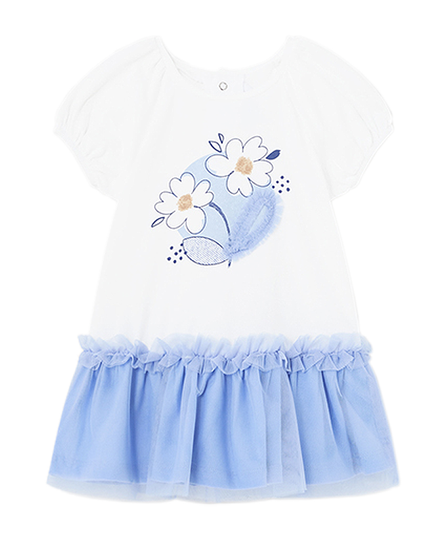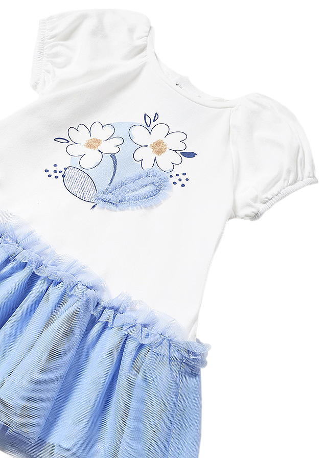 Rochita tul - BleuRochita cu maneca scurta are gulerul rotund si inchiderea prin capse pe partea din spate, pentru  a usura imbracarea. Materialul este moale din bumbac elastic si tul.  Material: 76% Bumbac