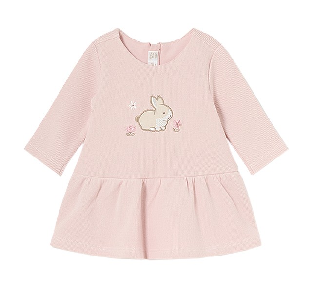Set 3 piese - Rochie + vesta blanita + bentita Setul cuprinde: - rochita cu maneca lunga - vesta blanita - bentitaRochia are maneca lunga cu gulerul rotund, iar inchiderea se realizeaza cu fermoar invizibil pe spate, pentru a facilita imbracarea micutei.Modelul are volan in partea de jos. Design: aplicatie iepuras aplicat si floricele brodate.Culoare: roz palMaterial: rochie - 100% bumbac