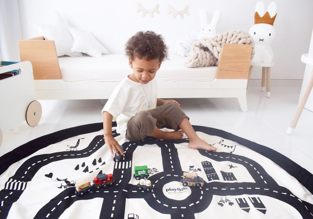 Ce poate fi mai palpitant daca nu o cursa de masini? Copii vor fi incantati sa petreaca timpul jucandu-se pe acest covoras cu masinutele si imaginandu-si adevarate raliuri!Sacul este o solutie simpla si eficienta pentru depozitarea jucariilor, dar si un spatiu de joaca sau un mod de a-ti invata copilul sa stranga usor toate lucrurile cand a terminat sa se joace.