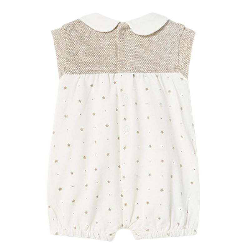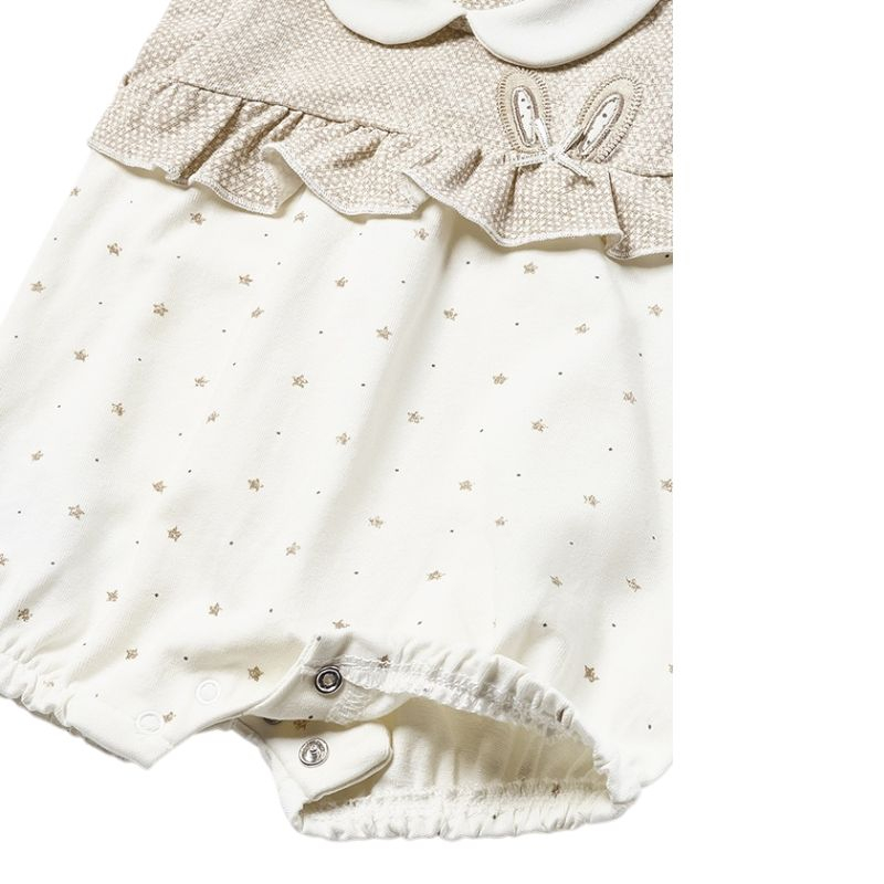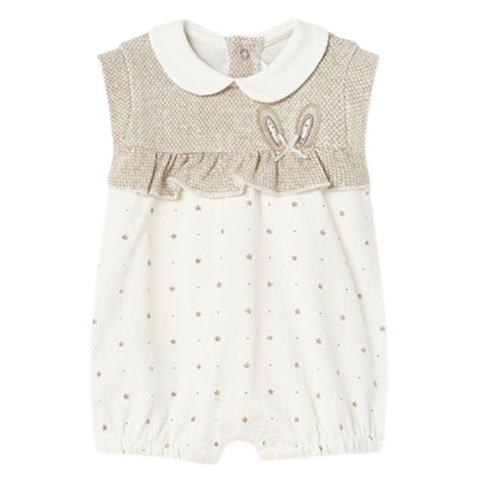 Salopeta cu guler din bumbac sustenabil- iepurasSalopeta fara maneci si un guler rotund alb din material ECOFRIENDS bumbac sustenabil.Inchiderea baody-ului se face cu 4 capse pe spate, 3 capse intre picioruse si are aplicat un volanas in talie.