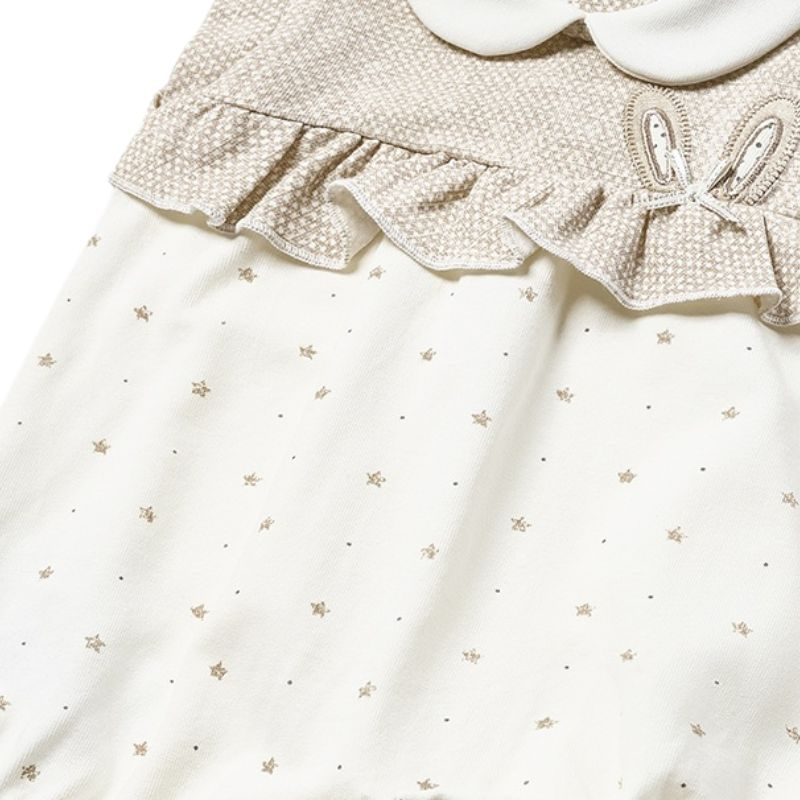 Design: aplicatie fundita si broderie urechiuse iepurasMaterial: 93% Bumbac 5% Elastan 2% InCuloare: Alb/bejImprimeu: stelute si picatele
