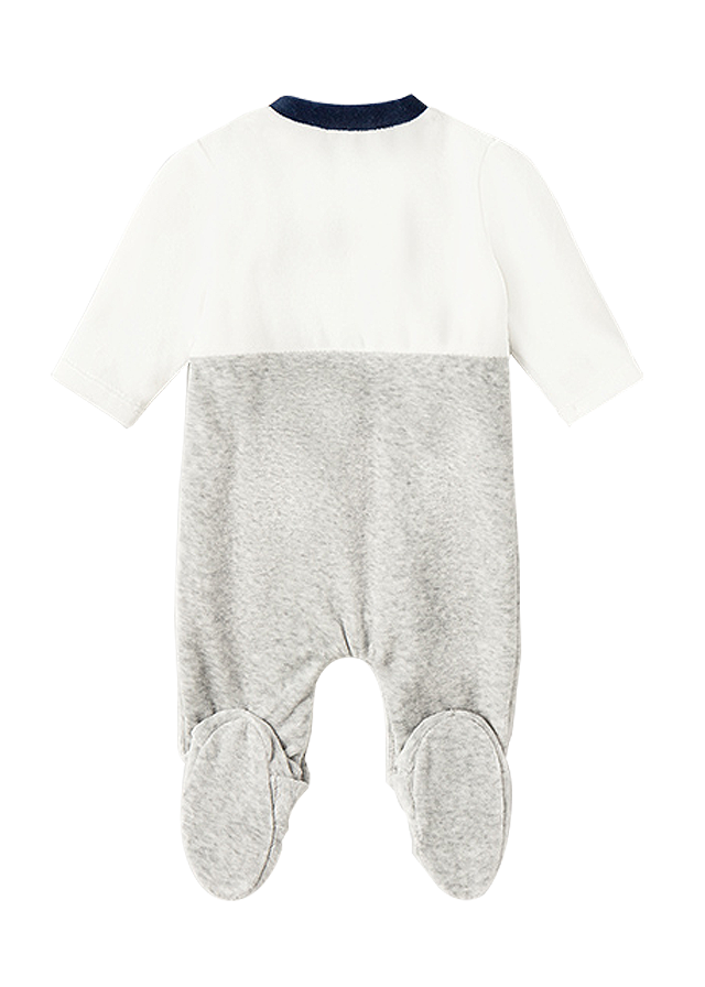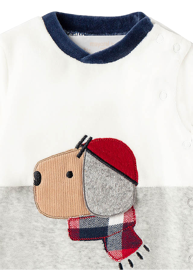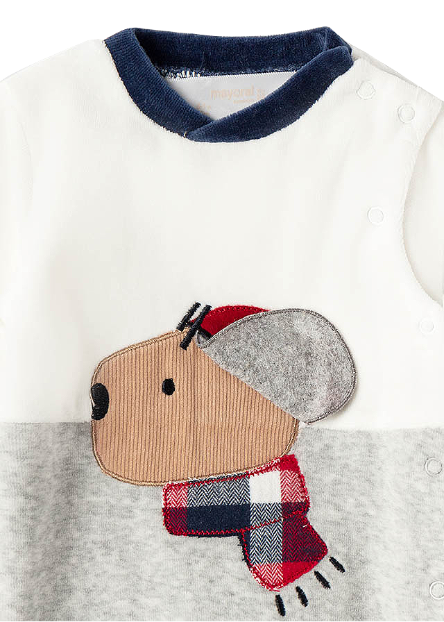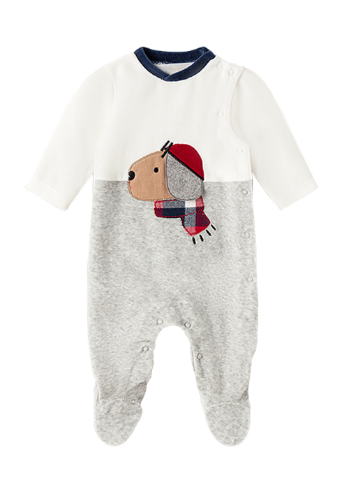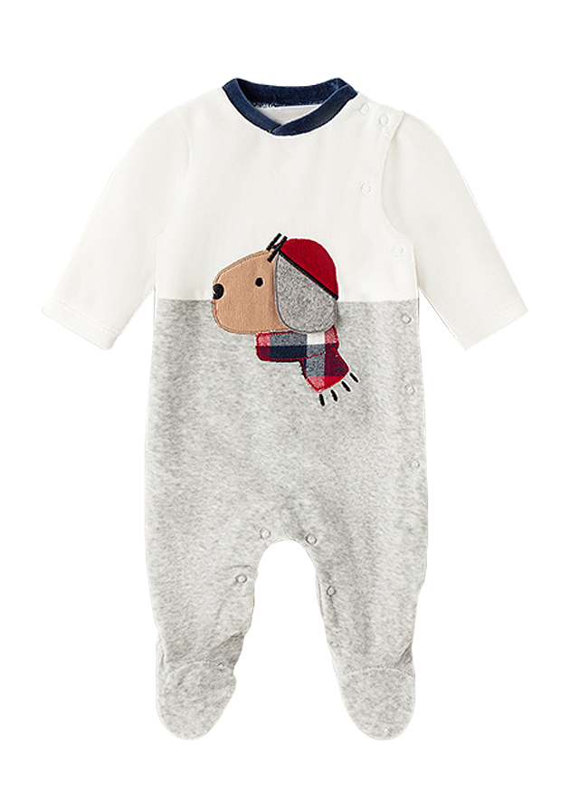 Salopeta (pijama) - Catelus Salopeta (pijama) are maneca lunga, un guler rotud si botosi.Inchiderea se face cu capse pe partea stanga de sus pana jos si pe interiorul picioruselor.Elemente decorative: aplicatie catelusProdusul se prezinta intr-o cutie din linia Newborn, ideala pentru cadou.Material: salopeta - 80% bumbac / 20% poliesterCuloare: alb / griIntretinere: