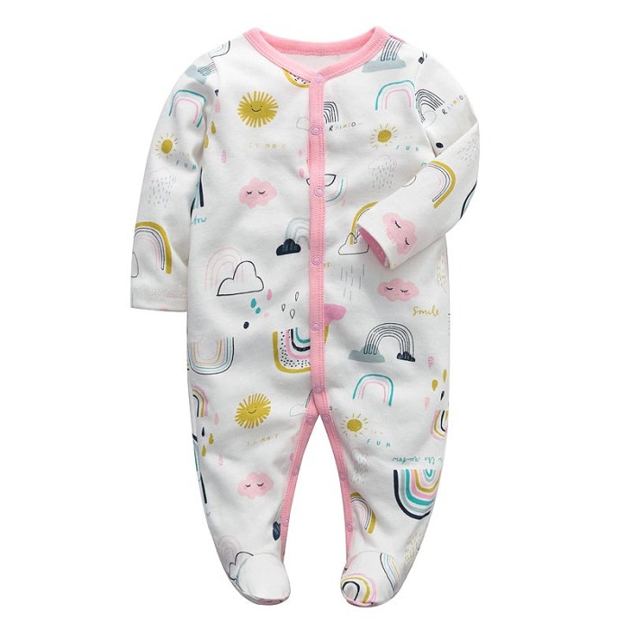 Salopeta (pijama) cu botosi - CurcubeeSalopeta (pijama) are maneca lunga, un guler rotud si botosi.Inchiderea se face cu capse de calitate, incepand de pe fata salopetei si continuind pe interiorul picioruselor facilitand o imbracare ușoara și practica a celui mic.Aceasta este imprimata intr-o culoare contrastanta. Imprimarea este realizata dupa o metoda durabila si sigura cu vopsea pe baza de apa, fara substante toxice, pentru a proteja pielea sensibila a bebelusului.Material: 100% bumbacCuloare: alb / rozImprimeu: norisori / curcubee / soareIntretinere: