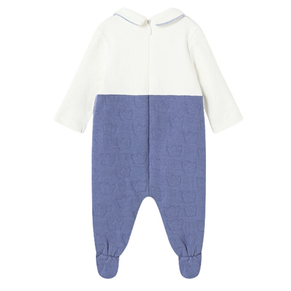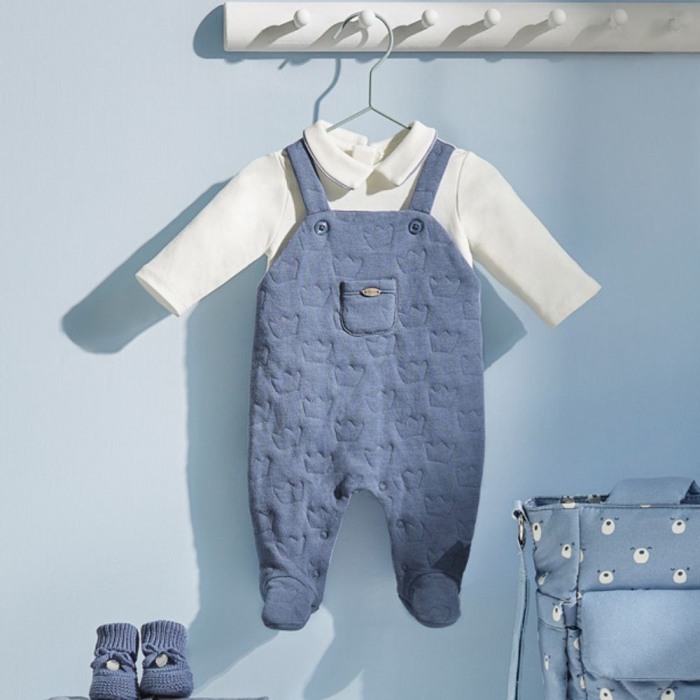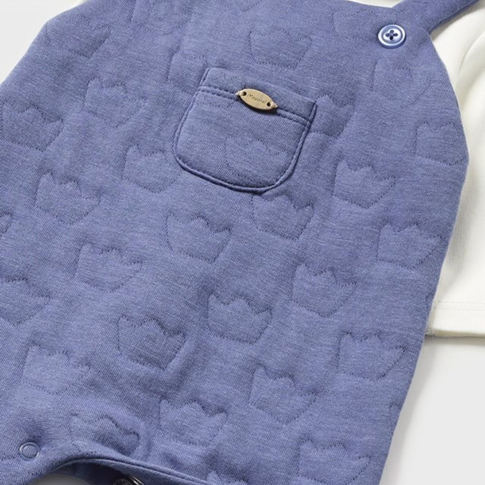 Salopeta simulata bumbac BCI Bleu nou-nascut Salopeta are maneca lunga, un guler rotud si botosi.Inchiderea se face cu fermoar pe spate si in interiorul picioruselor.Elemente decorative: buzunar cu funditaProdusul se prezinta intr-o cutie din linia Newborn, ideala pentru cadou.Material: 83% bumbac / 17% elastan iar captusela 100% bumbacCuloare: bleu, bejIntretinere: