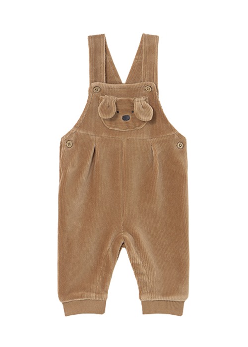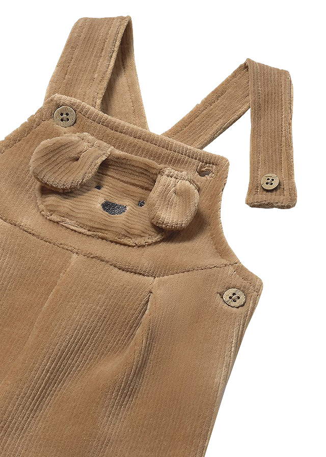 Salopeta are pieptar cu bretele si buzunar aplicat in forma de catelus functional.Atat bretelele cat si lateralele salopetei se inchid cu nasturi.Modelul are pliuri, capse intre picioare pentru a facilita imbracarea copilului. Materialul este calduros, foarte confortabil si moale.