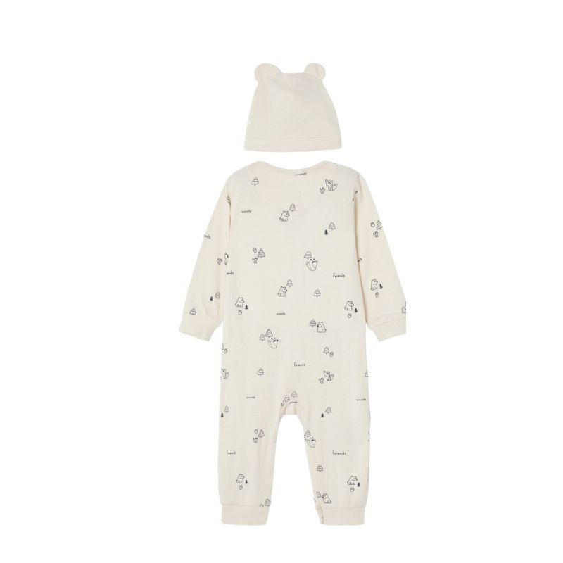 Set 3 piese cadou ECOFRIENDS - Animale junglaSetul este format din 2 piese:    - salopeta     - caciulitaSalopeta are maneca lunga si guler rotud Inchiderea se face cu capse pe partea din fata. La masurile mari (18l luni - 3 ani) nu exista capse pe partea interioara a pantalonului. Doua buzunare aplicate pe partea din fata.Material este moale, din bumbac.Caciulita este din bumbac si are imprimeu la fel ca si salopeta iar in plus are urechiuse haioase atasate.Este excelenta in serile racoroase cand mergi la plimbare.Material:  salopeta - 99% Bumbac 1% Elastan                                      caciulita - 100% Bumbac                                      captuseala - 100% bumbacCuloare: bejImprimeu: animale padure / braziIntretinere: