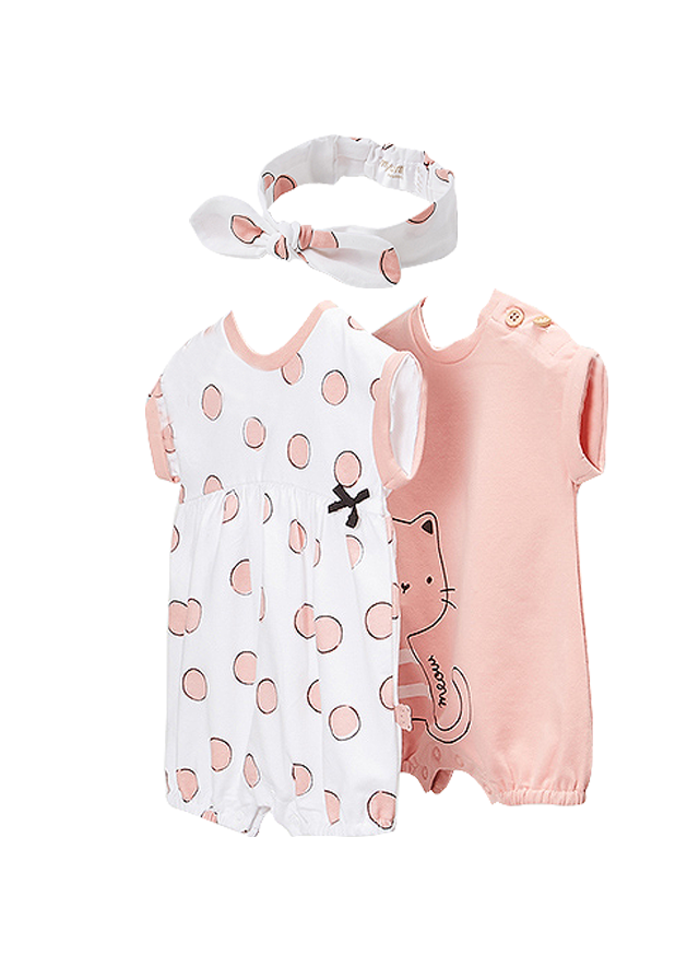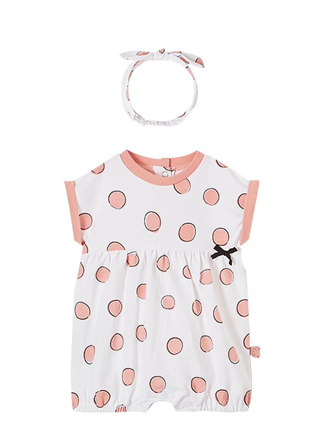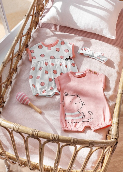 Set 2 salopete (pijamale) + Bentita ECOFRIENDSSetul de doua salopete (pijamale) asortate, au maneca scurta si un guler rotud.Inchiderea salopetei cu buline se face cu capse pe partea posterioara si intre picioruse, pentru a usura imbracarea bebelusului.Inchiderea salopetei corai se face cu nasturi pe umarul stang si intre picioruse cu capse, pentru a usura imbracarea bebelusului.Material este moale, din bumbac elastic.Bentita de par tip elastic o poti combina ca accesoriu la orice tip de look.Material: salopeta - 95% bumbac / 5% elastan bentita - 95% bumbac / 5% elastanCuloare: alb / coraiImprimeu: buline / pisicutaIntretinere: