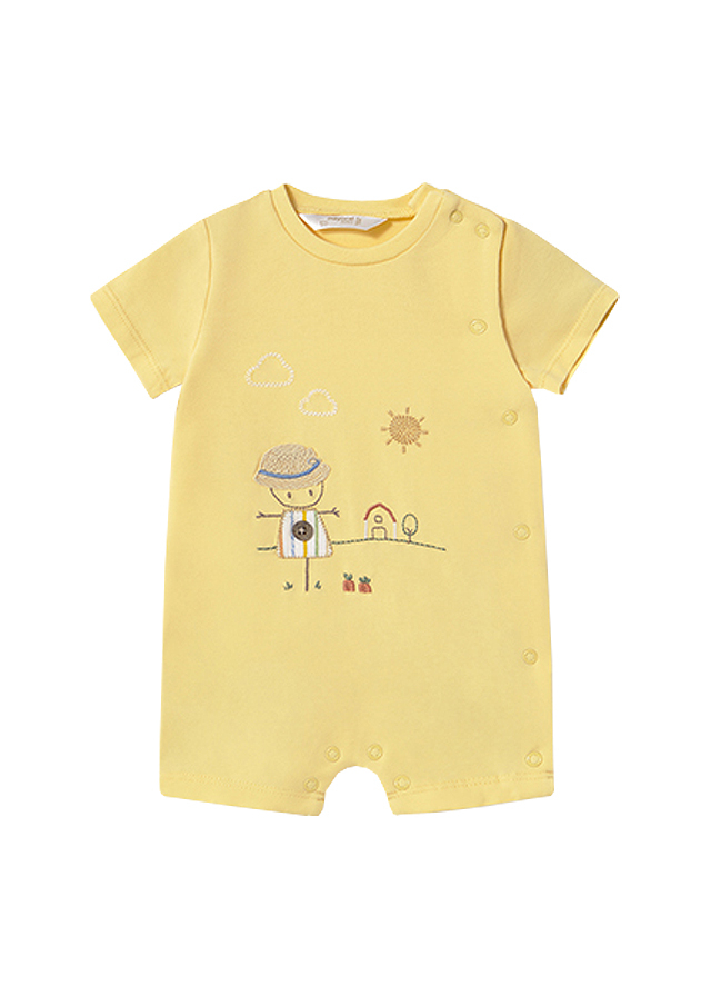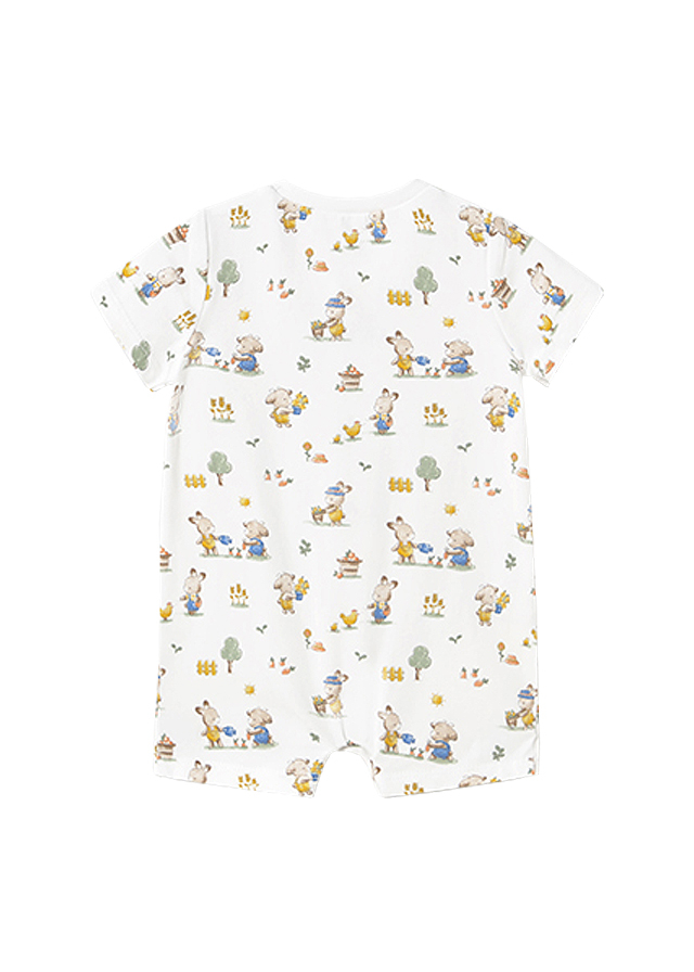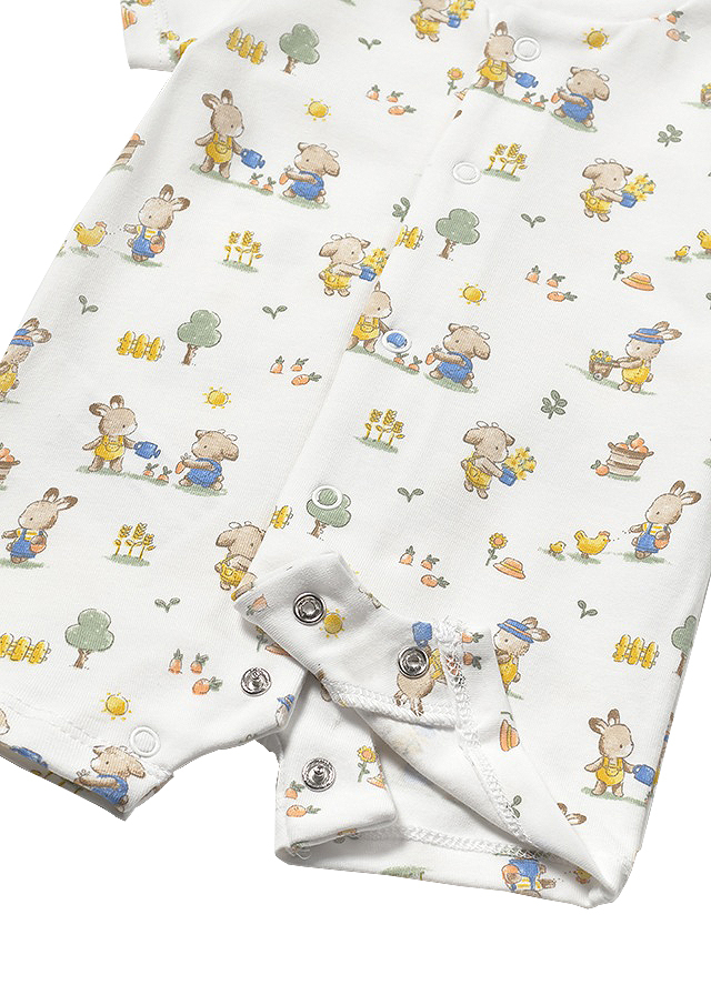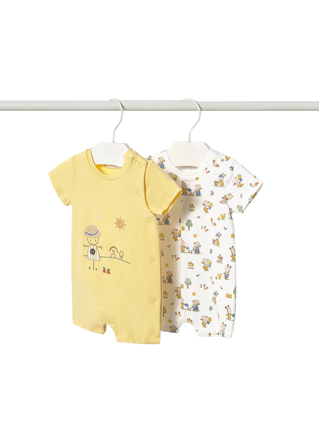 Set 2 salopete (pijamale) scurteSetul de doua salopete (pijamale) asortate au maneca scurta si gulerul rotund.Inchiderea se face cu capse pe partea stanga de sus pana jos si pe interiorul picioruselor.Elemente decorative: aplicatiiMaterial: 95% bumbac / 5% elastanCuloare: alb / galbenImprimeu: animale de padureIntretinere: