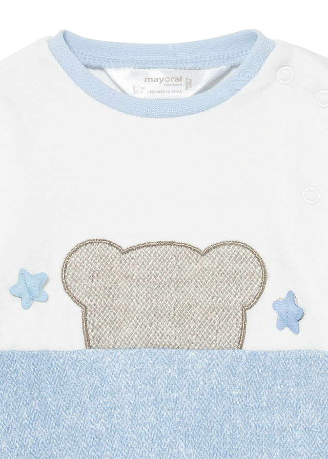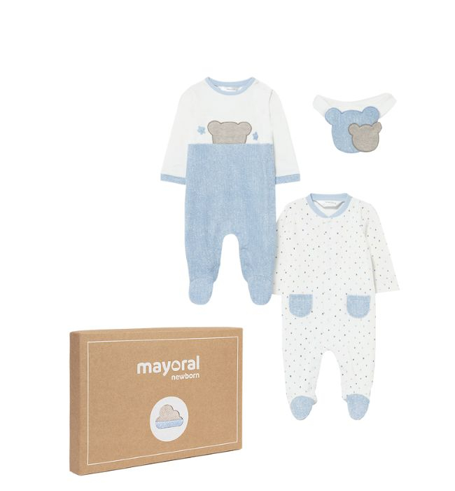 Set 2 salopete (pijamale) - ursulet / buline + baveticaSetul de doua salopete (pijamale) asortate, au maneca lunga, un guler rotund si botosi.Inchiderea se face cu capse pe umarul stang / fata salopetei si pe interiorul picioruselor.Material este moale, din bumbac sustenabil.Baveta se foloseste in perioada eruptiilor dentare sau cand incepi diversificarea mancarurilor, iar in momentul acela vei avea nevoie de ea cu siguranta.Elemente decorative: aplicatii ursuletiProdusul se prezinta intr-o cutie din linia Newborn, ideala pentru cadou.Material: salopeta - 99% bumbac / 1% elastan baveta - 99% bumbac / 1% elastanCuloare: alb / bleuImprimeu: urs / bulineIntretinere: