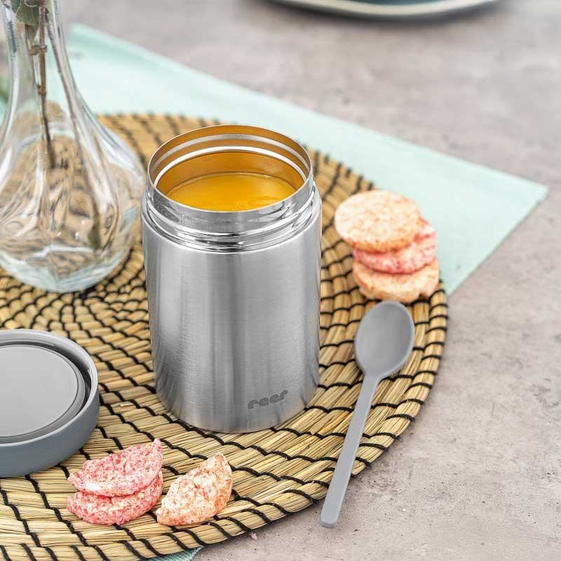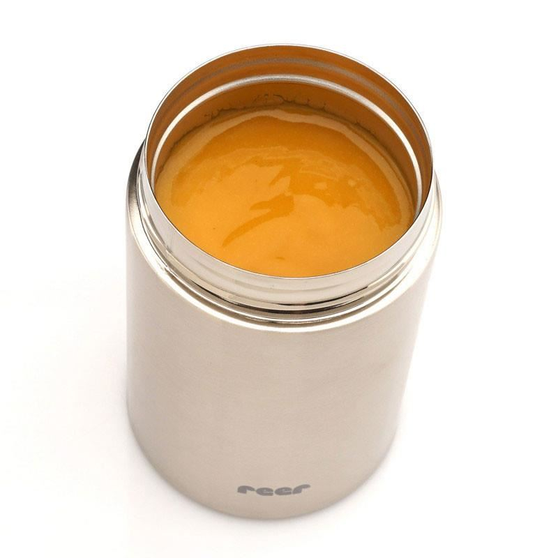 Indiferent daca este timpul pentru o gustare mica sau o masa completa, atunci cand sunteti in oras cu copiii mici, cel mai bine este sa aveti intotdeauna ceva la indemana de mancat. Cand cei mici au nevoie de o masa hranitoare departe de casa, trebuie sa actionati rapid.Recipientul Pure pentru pastrare la cald sau la rece permite transportul sigur si etans al alimentelor, mentinandu-le temperatura pana la 6 ore. Chiar si atunci cand copilul tau a ramas fara piure, cutia termoizolatoare ramane instțitorul tau loial in excursii. De exemplu, muesli, nucile si biscuitii pot fi depozitate in siguranta in cutie. In zilele calde, fructele si legumele sunt pastrate placut la rece, asigurandu-se ca nu isi pierd prospetimea.Sigiliul din silicon al cutiei termice Pure asigura recipientul impotriva scurgerilor. Sistemul de izolare cu vid cu doua panouri previne transpiratia cutiei si formarea picaturilor de condens. Baza cutiei termo a fost acoperita cu un material asemanator siliconului, cu efect anti-alunecare. Acest fund practic previne rasturnarea accidentala a cutiei, protejand suprafetele vulnerabile.Carcasa robusta este realizata din otel inoxidabil 18/8, care este cunoscut pentru nivelul sau ridicat de puritate. Materialul rezista fara efort utilizarii zilnice si este deosebit de durabil, rezistent la rugina si la zgarieturi. Otelul inoxidabil este sigur pentru alimente si protejeaza continutul de influentele externe, fara a oferi alimentelor un gust metalic. Eliminarea unui strat intern suplimentar inseamnă ca aceasta cutie termo nu are miros sau gust si nu contine BPA, PVC si plastifianti nocivi.Cutia termo Pure poate fi folosita multi ani. Este alternativa perfecta pentru borcanele pentru alimente pentru copii, care ajung direct la gunoi dupa utilizare. Reer este un brand orientat spre protectia mediului si ecologie si 100% atent la calitatea si utilitatea produselor pentru siguranta si ingrijirea bebelusilor.Specificatiile produsuluimentine alimentele calde pana la 6 oreideal pentru prepararea si depozitarea alimentelor pentru bebelusicorp solid din otel inoxidabil, deosebit de durabil, incasabil, care nu rugineste si este rezistent la zgarieturimateriale sigure pentru alimente, fara BPA, PVC sau plastifianti nociviigienic, insipid si indistructibilcu fund practic anti-alunecareo alternativa perfecta la poluantele sticle de unica folosintavolum nominal de umplere: 300 mldiametru 7 cm (permite umplerea cu piureuri, bucati de fructe, cereale etc)