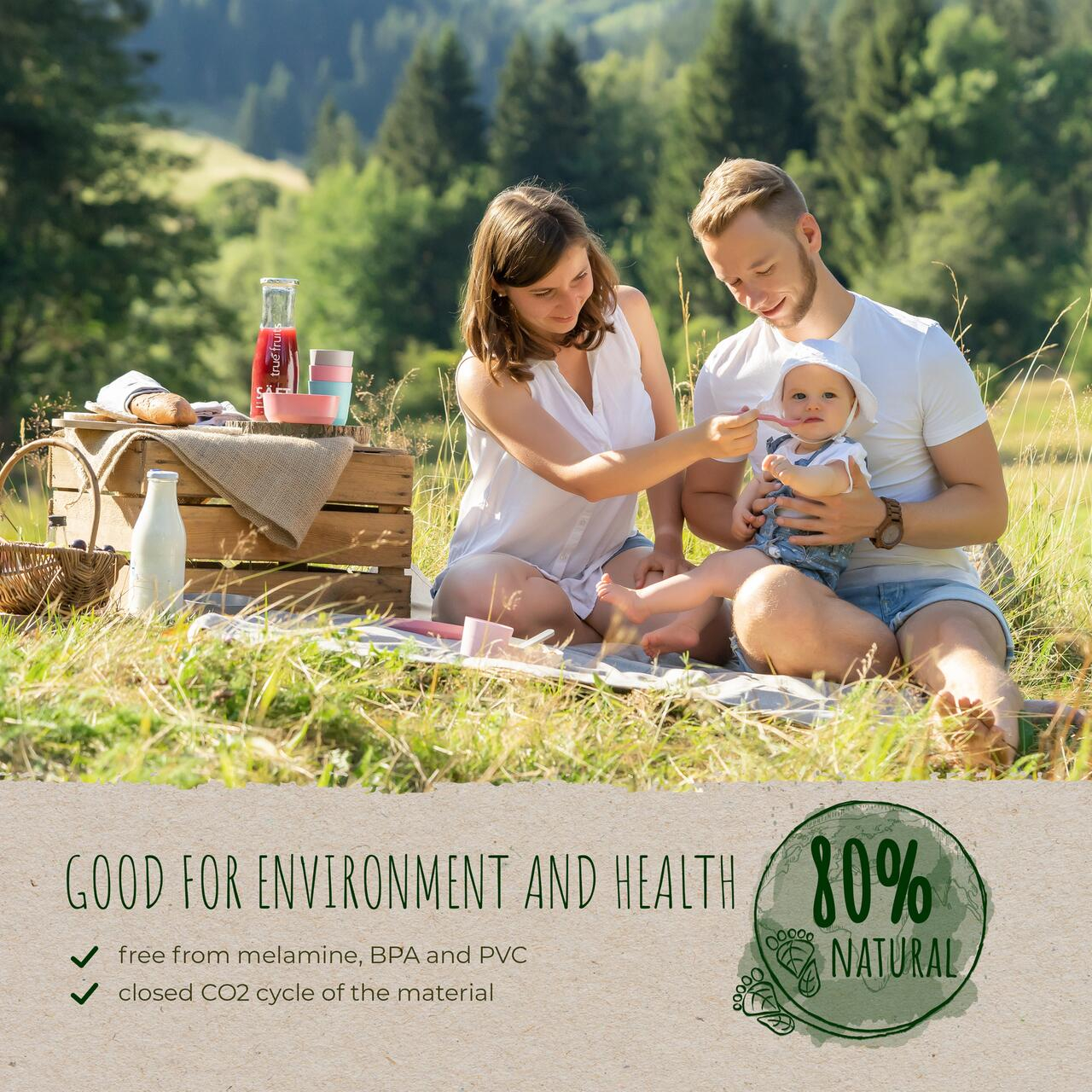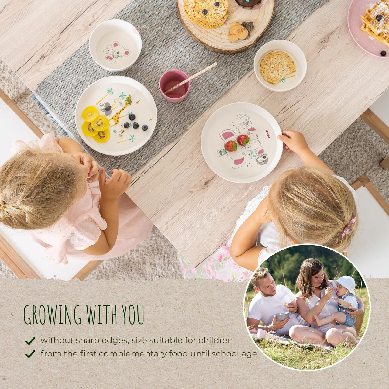 Setul de vesela din seria Growing de la Reer este deosebit de potrivit pentru a invata copiii sa manance independent. Toate cele 5 compenente ale setului (farfurie, castron, lingurita, furculita si pahar) au fost bine gandite ca sa ii sprijine pe cei mici. De exemplu tacamurie au manere largi pentru a ajuta copilul sa le tina cu usurinta in mana iar farfuria are marginea ridicata pentru a impiedica copilul sa impinga mancarea afara din farfurie. In plus dimensiunea și greutatea fiecarei vesele sunt ideale pentru mainile copiilor si pot fi folosite pe tot parcursul copilariei.Culorile vesele si printurile dragalase il imbie pe bebelusul tau la masa, stimuland curiozitatea si interesul pentru alimente. Vesela Reer cu suprafata sa robusta rezista conditiilor grele din viata de zi cu zi si poate fi folosita si la cuptorul cu microunde fara probleme. Marginile rotunjite si materialul incasant garanteaza o utilizare in siguranta pentru mult timp. Pentru o curatare deosebit de comoda si igienica, vasele pot fi curatate si in masina de spalat vase.Setul de vesela Growing de la Reer face parte dintr-o gama de produse pentru tranzitia catre hrana solida, prietenoase nu doar cu copiii ci si cu mediul inconjurator, fiind fabricate din materiale naturale de inalta calitate, peste 80% materii prime regenerabile (zahar si alti carbohidrati, fibre de lemn) si nu contin substante periculoase cum ar fi melamina, PVC sau BPA. Ambalajele prietenoase cu mediul sunt din hartie reciclata.La fel ca toate produsele Reer, si vesela este fabricata conform celor mai inalte standarde de calitate, fiind certificate in conformitate cu standardul de siguranta EN 14372.Specificatiile produsului:Set de vesela pentru copii fabricat din peste 80% materii prime regenerabile (zahar si alti carbohidrati, fibre de lemn)Contine o farfurie, un castron, un pahar, o lingurita si o furculitaRezistente la cuptorul cu microunde (maxim 600W) si in masina de spalat vase Deosebit de usoare si indestructibile, pot face fata cu usurinta aterizarilor dureMarginile rotunjite garanteaza o utilizare in sigurantaMarginea lata a farfuriei si castronului usureaza prinderea, iar peretele exterior inaltat faciliteaza scoaterea mancarii cu linguritaTacamuri cu manere ergonomice ce ajuta bebelusul sa le prinda bine in manaForma practica, permit stivuirea pentru economisirea spatiuluiDesign vesel, cu printuri dragalase si culori naturaleFabricate din materiale de inalta calitate, non-toxice, fara BPA, fara PVC si fara melaminaCertificate in conformitate cu standardul de siguranta EN 14372