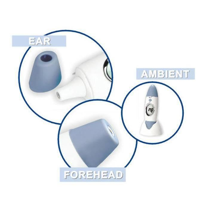 Termometru cu infrarosii pentru tampla si urecheCel mai rapid si mai discret mod de masurare a temperaturii corpului.Masoara instant temperatura corpului pe tampla sau in ureche, folosind razele in infrarosu.In perioada de stand-by afiseaza temperatura camerei si ceasul.Are stativ pentru depozitare si la nevoie emite semnal de alarma la starea de febra (37,5°C).Memoreaza ultima valoare masurata.Nu are nevoie de capac de protectie igienica, senzorul poate fi curatat cu apa sau alcool.Se livreaza impreuna cu baterii, stativ pentru depozitare si manual de utilizare in limba romana.Produs certificat conform normelor Comunitatii Europene.Carateristici tehnice:Aria de masurare: de la 10°C pana la 50°Cpentru temperaturi sub 10°C: este afisat „Lo“pentru temperaturi peste 50°C: este afisat „Hi“Timp de masurare: 1-3 secundePrecizia de masurare: 0,3°C pt. valori intre 10°C - 36°C sau 39,1°C - 50°C 0,2°C pentru valori intre 36,1°C - 39°CMemorie: pentru ultima valoare masurataCeas intern: cu quartz, afiseara ore si minuteAfisaj: ecran cu cristale lichide (LCD)Tip baterie: 1 bucata tip CR2032Temperatura de pastrare: de la 10°C pana la 50°CTermen de garantie: 2 ani