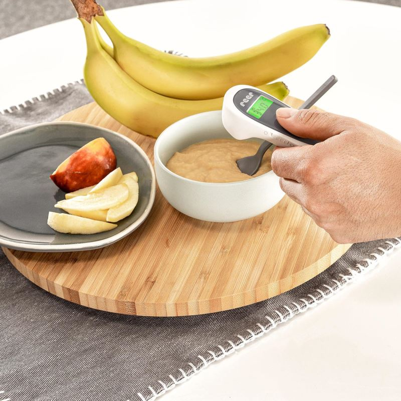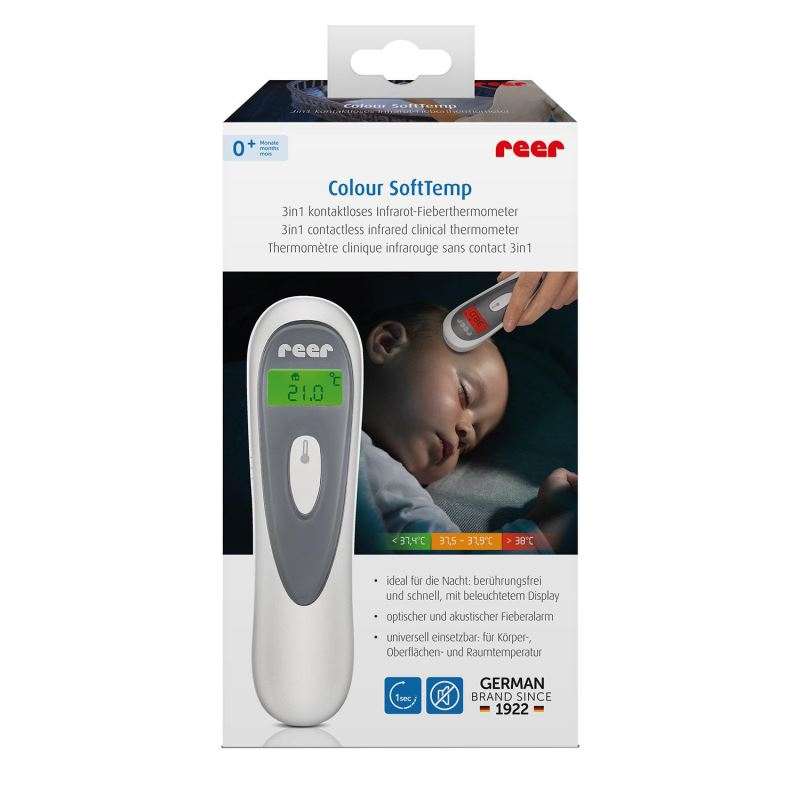 Termometru digital validat clinic, ce masoara intr-o secunda fara atingere temperatura corpului pe tampla, temperatura oricarui obiect intre 0 si 100 °C (biberon, mancare, apa, etc.) sau temperatura ambientala.Masuratori rapide, precise si igienice ale temperaturii, datorita senzorului in infrarosu cu precizie medicala, ce nu necesita contact.Ideal pentru intreaga familie, chiar si pentru bebelusii de la 0 luniPuteti masura temperatura bebelusului fara a-l deranja, chiar si cand doarmeSemnalizeaza si avertizeaza optic starea de febra, prin colorarea ecranului in 3 culori diferite: verde pt temperaturi mai mici de 37.5°C, portocaliu pentru temperaturi intre 37.5-37.9°C si rosu pentru temperaturi mai mari de 37.9°C.Emite suplimentar semnale acustice la starea de febra peste 37.9°CEcran LCD foarte mare si iluminat, pentru a asigura citiri confortabile si sigure, chiar si pe intunericSemnalele acustice pot fi oprite, pentru a asigura masuratori silentioase cand bebelusul doarmeMemoreaza automat ultimele 25 de valori masurate, pentru a usura urmarirea curbei de temperatura.Timp de masurare foarte scurt: aproximativ 1 secunda.Distanta de masurare: intre 1 si 3 cmInchidere automata dupa 15 secunde de la ultima masuratoare, pentru economisirea bateriilorAfisarea rezultatelor este posibila in °C (Celsius) sau °F (Fahrenheit)Intervalul de masurata a temperaturii corpului: 32℃ - 42,9℃Intervalul de masurata a temperaturii ambientale/obiectelor: 0℃ - 99.9 ℃Precizia de masurare pentru temperatura corpului: ±0.2°CAlimentare: 2 baterii alkaline AAA (incluse in pachet)Dimensiuni: 144 x 39 x 40 mmGreutate: 76 gCertificat ca dispozitiv medical conform normelor Comunitatii Europene, prezinta marcaj CE (CE0123)