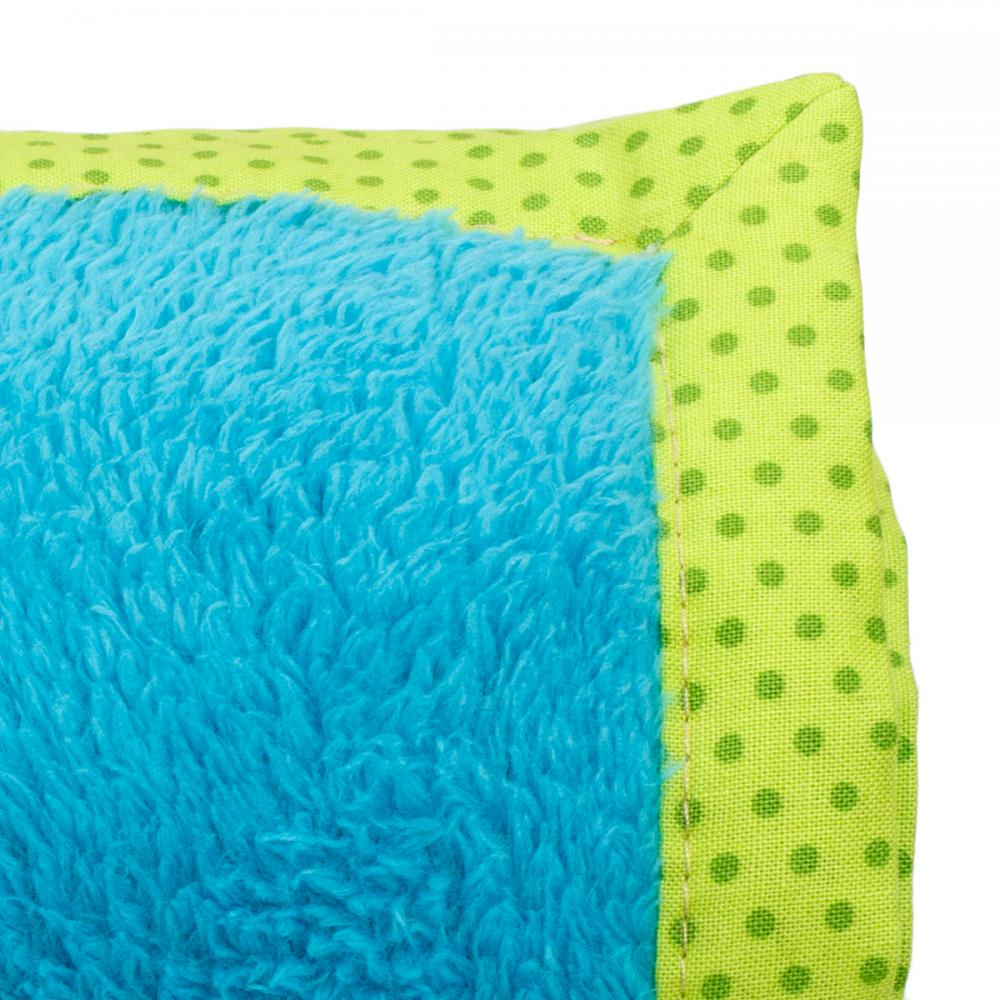 Pe marginea paturicii are un tiv din panza verde, imprimata cu buline.