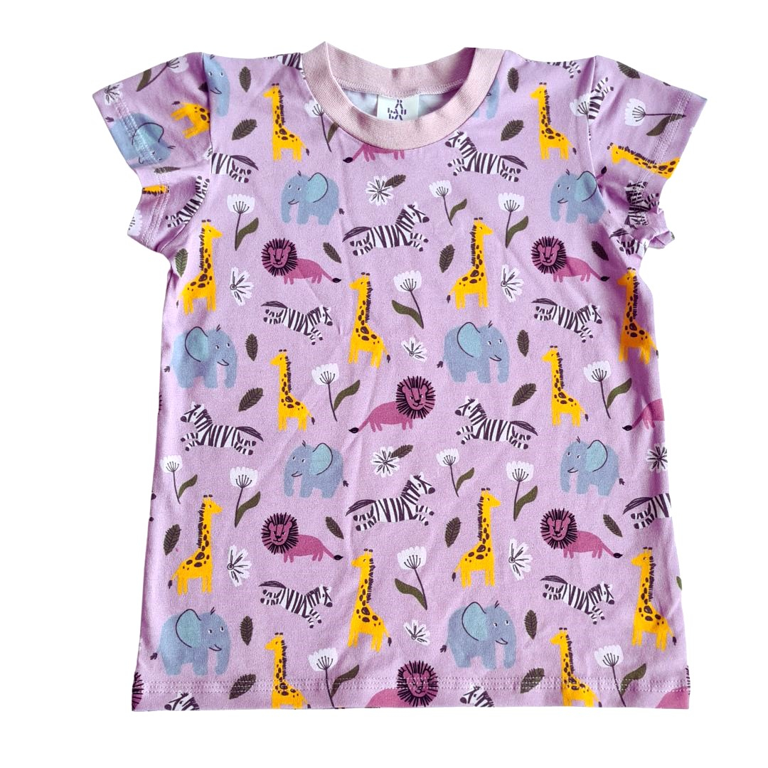 Tricou cu maneca scurta - JunglaTricoul este clasic, la baza gatului si maneca scurta.Materialul este de buna calitate, rezistent la spalat, iar culorile se pastreaza in timp. Material: 100% bumbacCuloare: lilaImprimeu: zebre girafe lei elefanti Spalare: automata / manuala