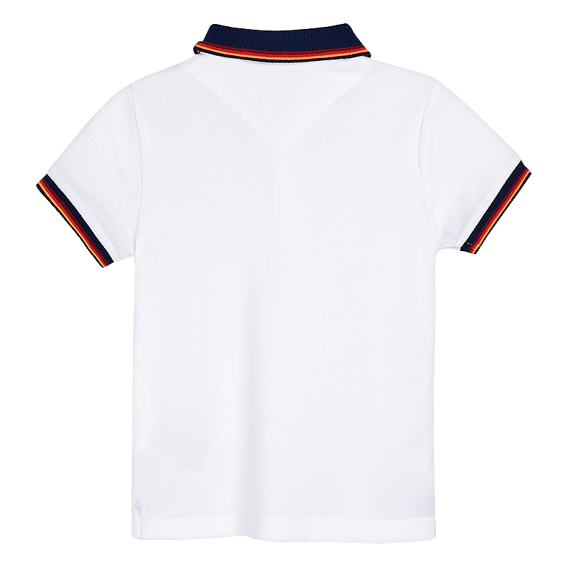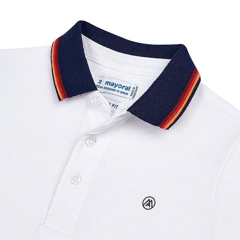 Tricou polo clasic cu maneca scurta - Alb/Bleumarin/PortocaliuTricoul cu maneca scurta clasic, tip Polo cu guler si deschidere cu 3 nasturi in fata.Material moale din bumbac elastic. Gulerul este bleumarin cu dunga subtire portocaliu.Model cu broderie mica pe partea stanga.